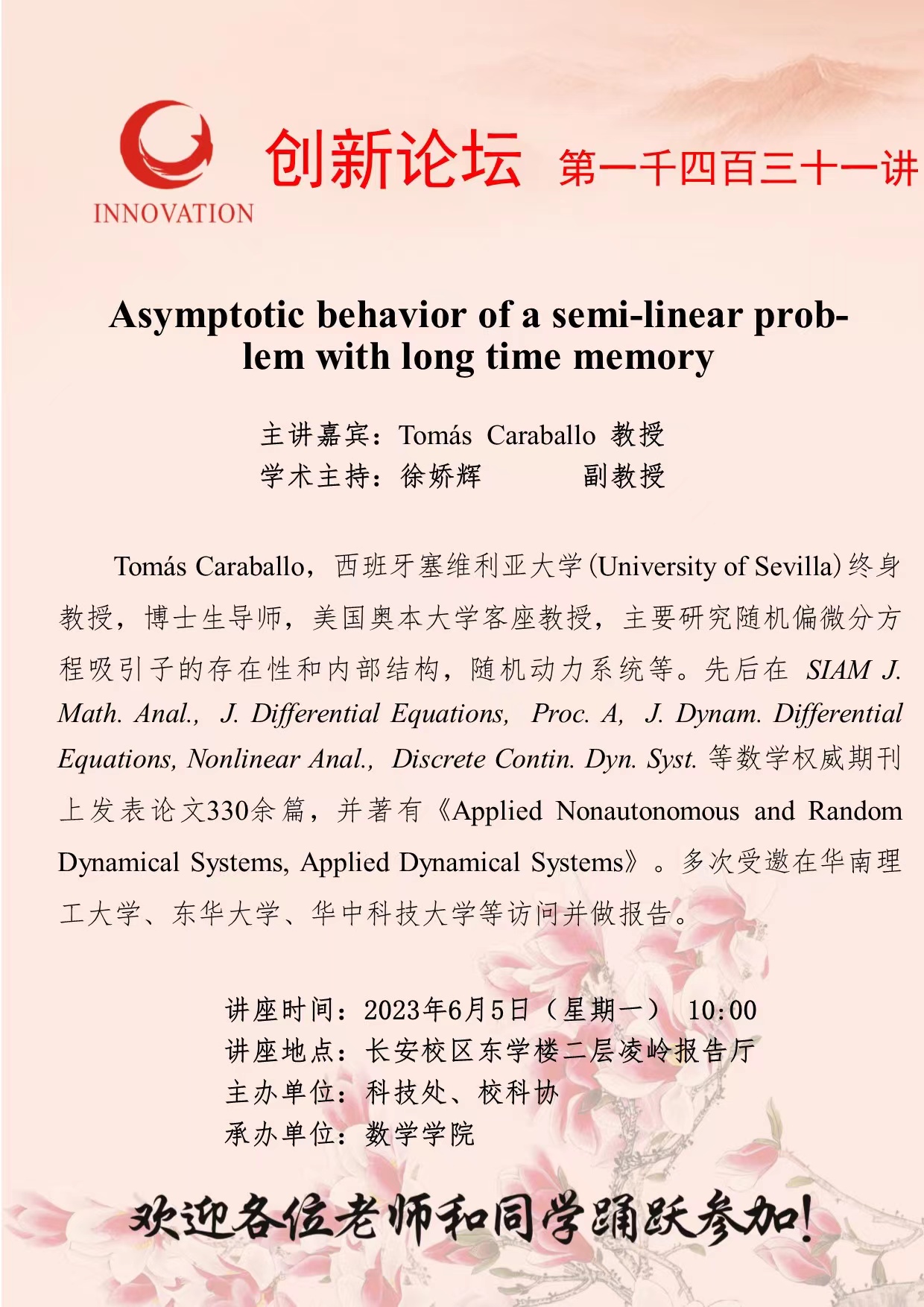 Tomás Caraballo 教授 welcome欢迎光临威尼斯集团创新论坛第一千四百三十一讲:Asymptotic behavior of a semi-linear problem with long time memory 讲座时间 2023年6月5日(星期一) 10:00 讲座地点 长安校区东学楼二层凌岭报告厅 讲座人介绍 Tomás Caraballo 教授 讲座内容