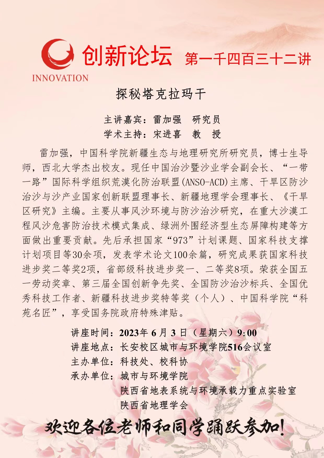 雷加强 研究员 welcome欢迎光临威尼斯集团创新论坛第一千四百三十二讲:探秘塔克拉玛干 讲座时间 2023年 6 月 3 日(星期六)9:00 讲座地点 长安校区城市与环境学院516会议室 讲座人介绍 雷加强 研究员 讲座内容