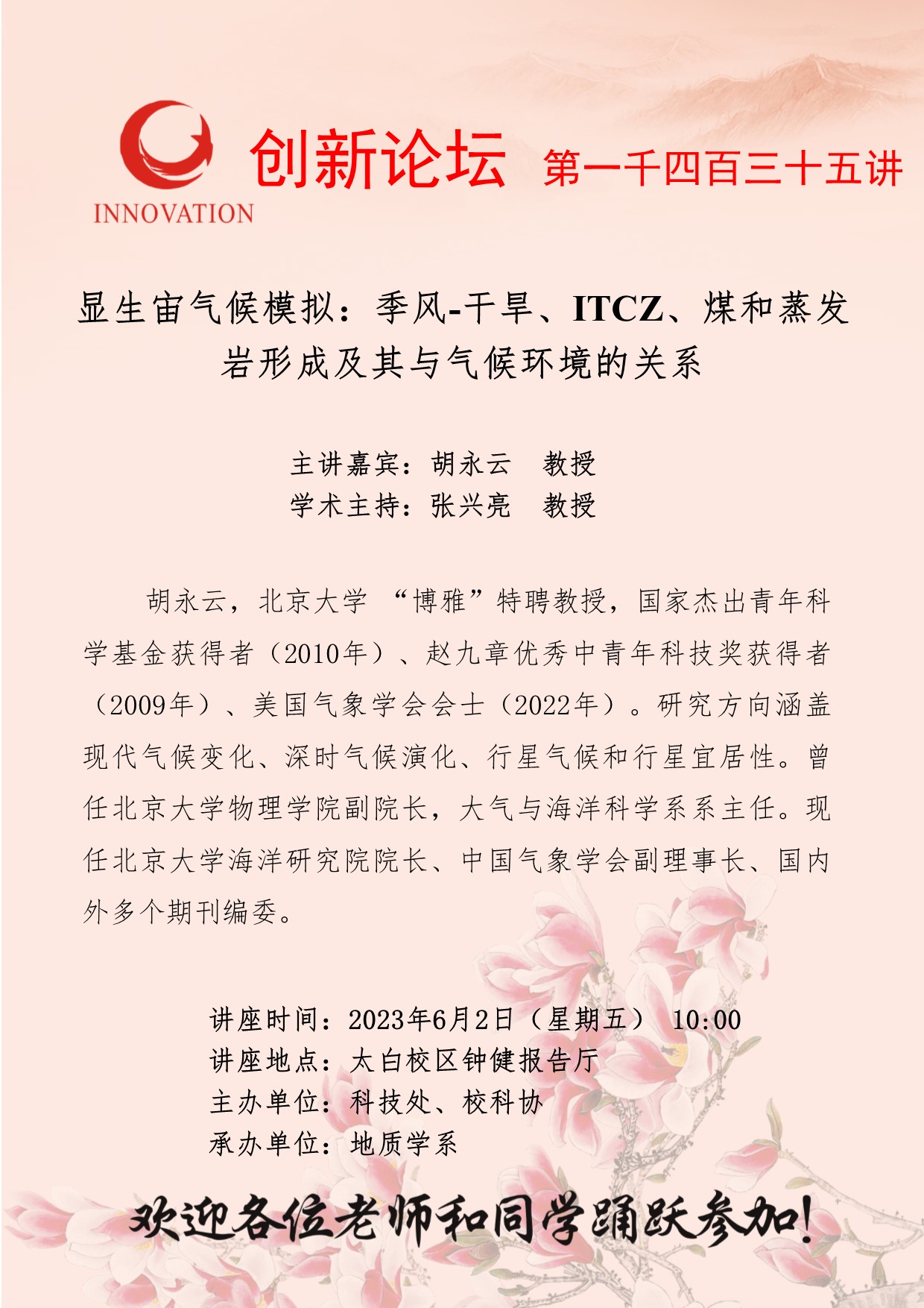 胡永云 教授 welcome欢迎光临威尼斯集团创新论坛第一千四百三十五讲:显生宙气候模拟:季风-干旱、ITCZ、煤和蒸发岩形成及其与气候环境的关系 讲座时间 2023年6月2日(星期五) 10:00 讲座地点 太白校区钟健报告厅 讲座人介绍 胡永云 教授 讲座内容
