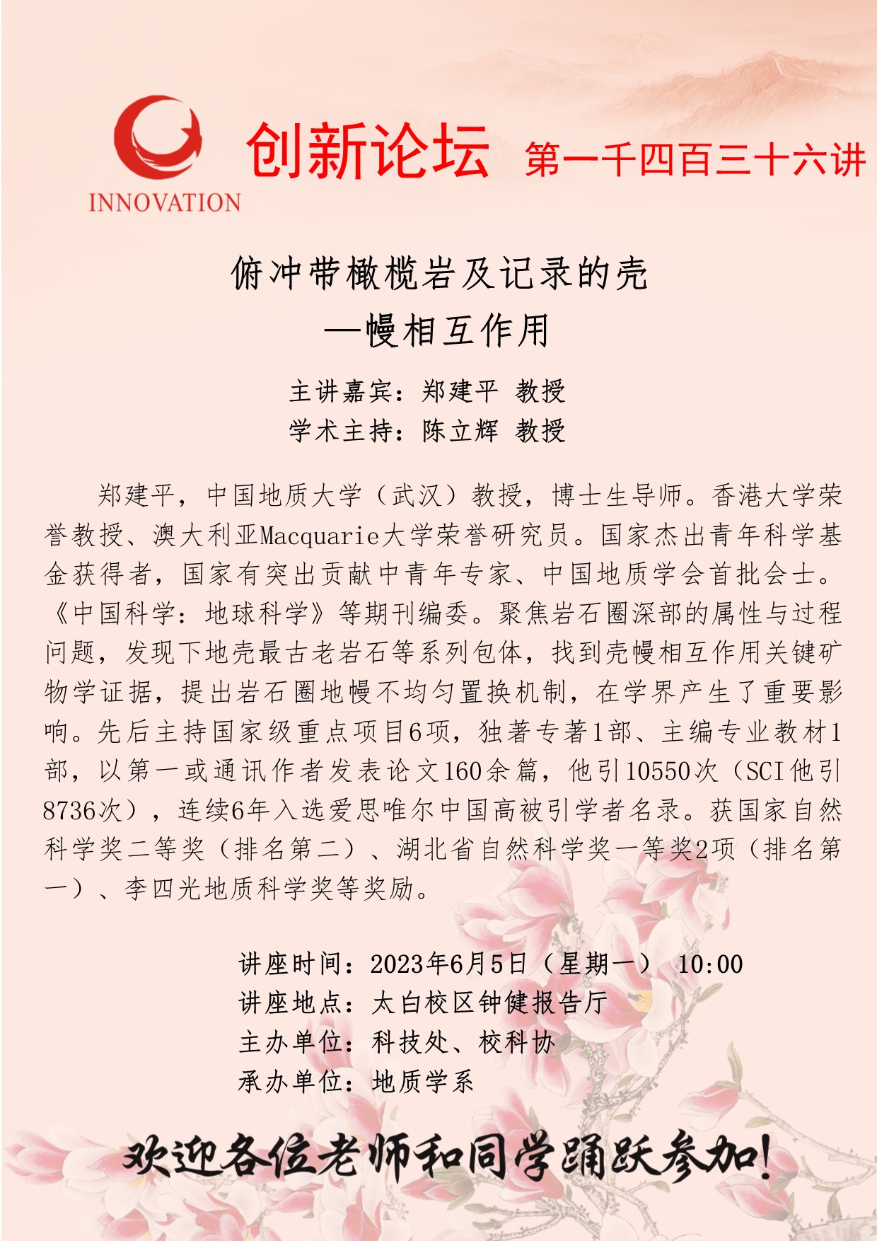 郑建平 教授 welcome欢迎光临威尼斯集团创新论坛第一千四百三十六讲:俯冲带橄榄岩及记录的壳—幔相互作用 讲座时间 2023年6月5日(星期一) 10:00 讲座地点 太白校区钟健报告厅 讲座人介绍 郑建平 教授 讲座内容
