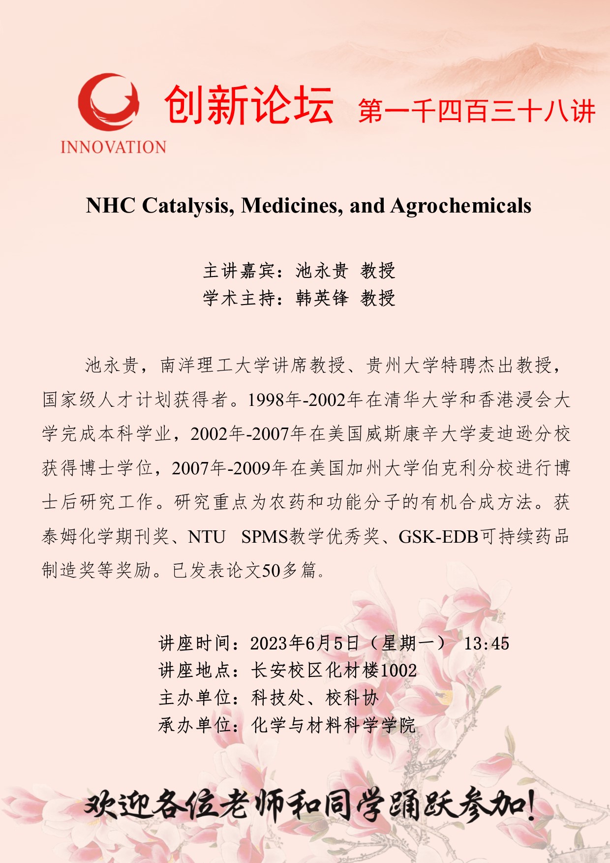 池永贵 教授 welcome欢迎光临威尼斯集团创新论坛第一千四百三十八讲:NHC Catalysis, Medicines, and Agrochemicals 讲座时间 2023年6月5日(星期一) 13:45 讲座地点 长安校区化材楼1002 讲座人介绍 池永贵 教授 讲座内容