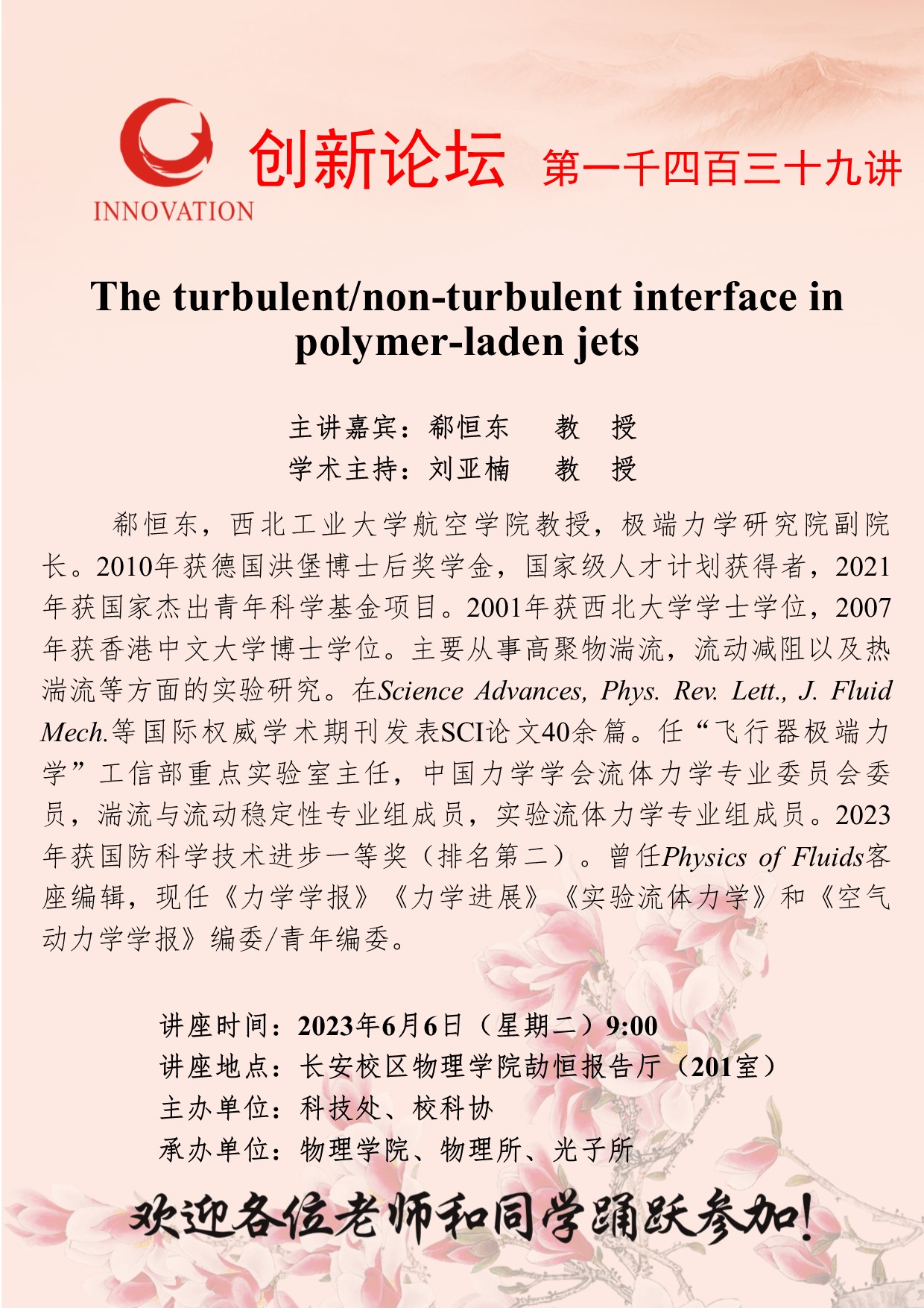 郗恒东 教授 welcome欢迎光临威尼斯集团创新论坛第一千四百三十九讲:The turbulent/non-turbulent interface in polymer-laden jets 讲座时间 2023年6月6日(星期二)9:00 讲座地点 长安校区物理学院劼恒报告厅(201室) 讲座人介绍 郗恒东 教授 讲座内容