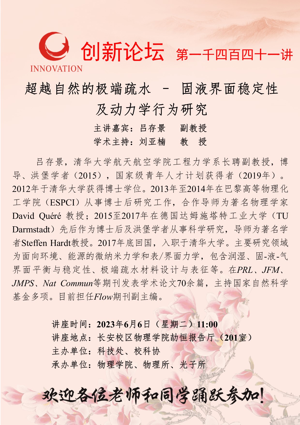 吕存景 副教授 welcome欢迎光临威尼斯集团创新论坛第一千四百四十一讲:超越自然的极端疏水 – 固液界面稳定性及动力学行为研究 讲座时间 2023年6月6日(星期二)11:00 讲座地点 长安校区物理学院劼恒报告厅(201室) 讲座人介绍 吕存景 副教授 讲座内容