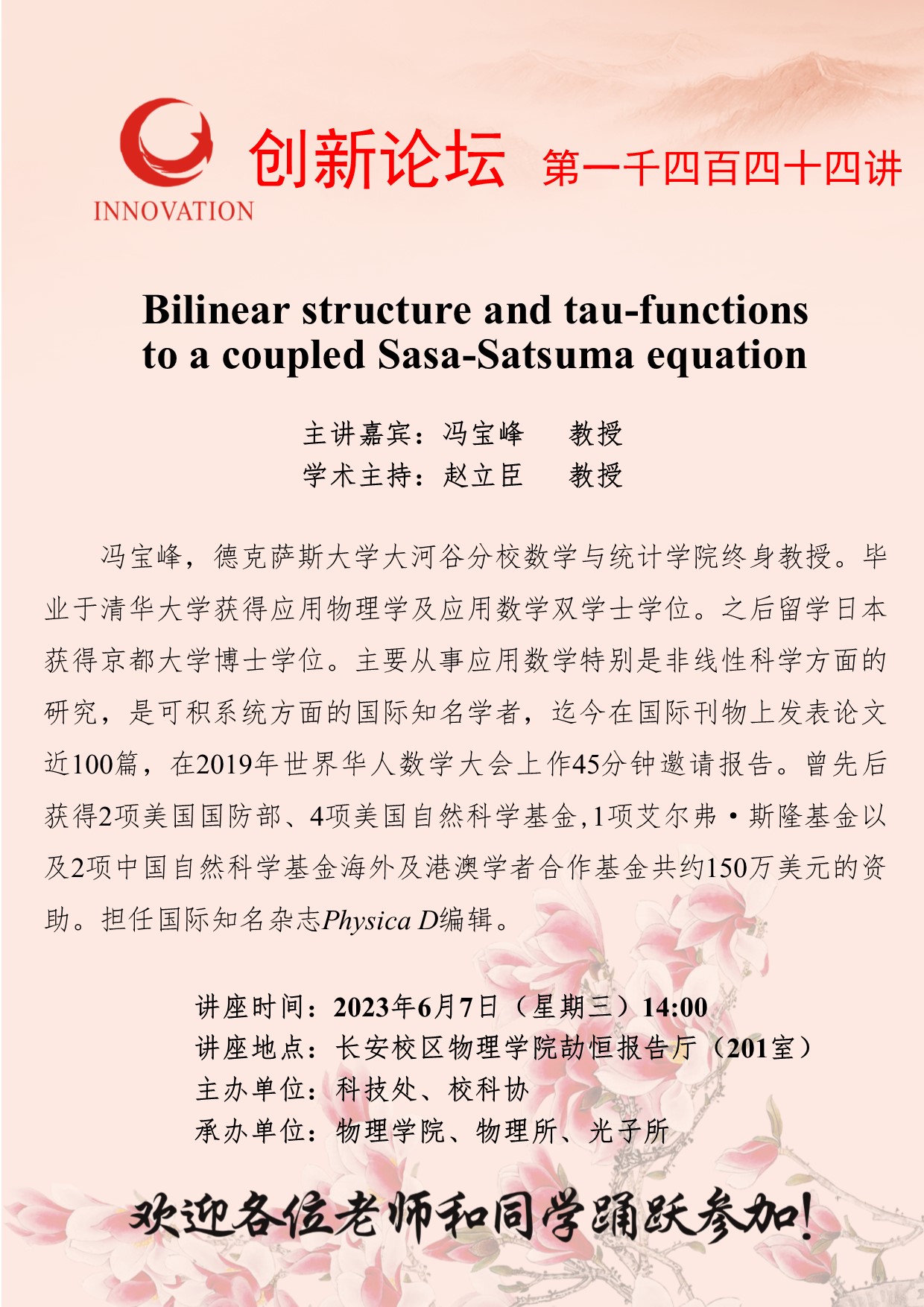 冯宝峰 教授 welcome欢迎光临威尼斯集团创新论坛第一千四百四十四讲:Bilinear structure and tau-functions to a coupled Sasa-Satsuma equation 讲座时间 2023年6月7日(星期三)14:00 讲座地点 长安校区物理学院劼恒报告厅(201室) 讲座人介绍 冯宝峰 教授 讲座内容