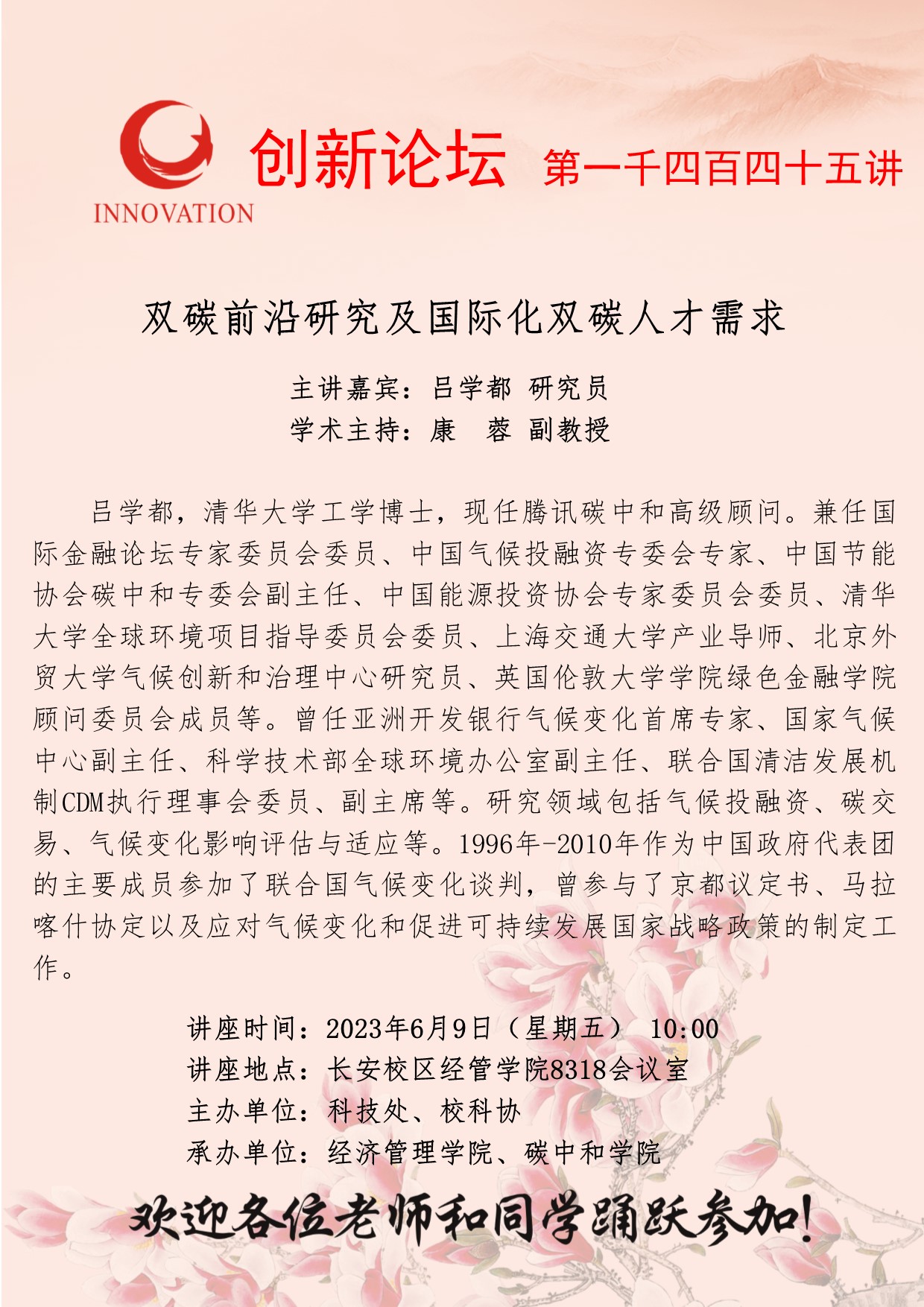 吕学都 研究员 welcome欢迎光临威尼斯集团创新论坛第一千四百四十五讲:双碳前沿研究及国际化双碳人才需求 讲座时间 2023年6月9日(星期五) 10:00 讲座地点 长安校区经管学院8318会议室 讲座人介绍 吕学都 研究员 讲座内容