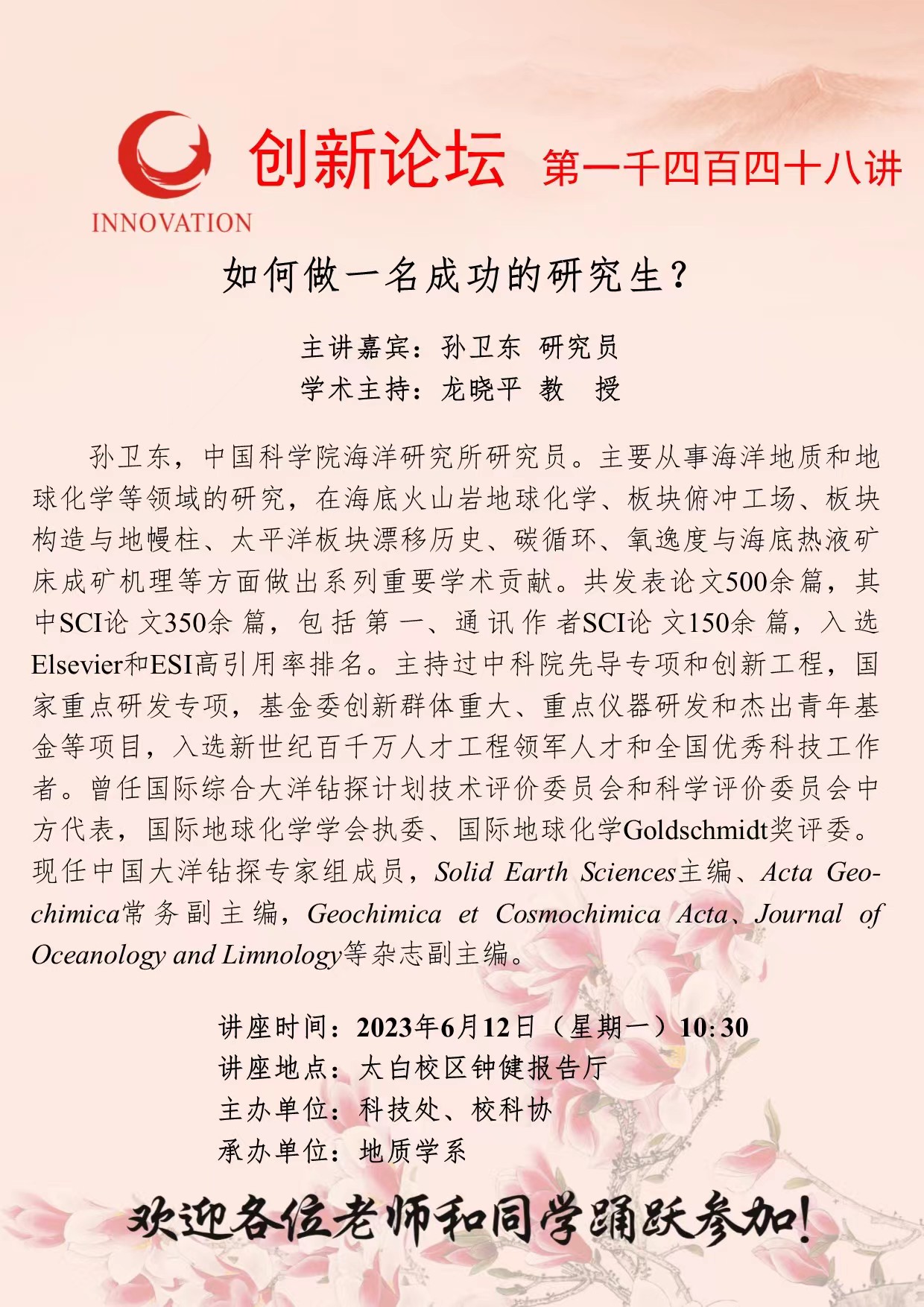 孙卫东 教 授 welcome欢迎光临威尼斯集团创新论坛第一千四百四十八讲:如何做一名成功的研究生? 讲座时间 2023年6月12日(星期一)10:30 讲座地点 太白校区钟健报告厅 讲座人介绍 孙卫东 教 授 讲座内容