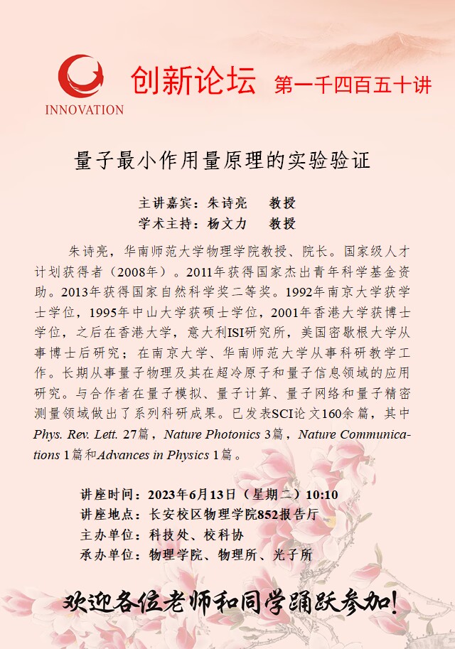 朱诗亮 教授 welcome欢迎光临威尼斯集团创新论坛第一千四百五十讲:量子最小作用量原理的实验验证 讲座时间 2023年6月13日(星期二)10:10 讲座地点 长安校区物理学院852报告厅 讲座人介绍 朱诗亮 教授 讲座内容