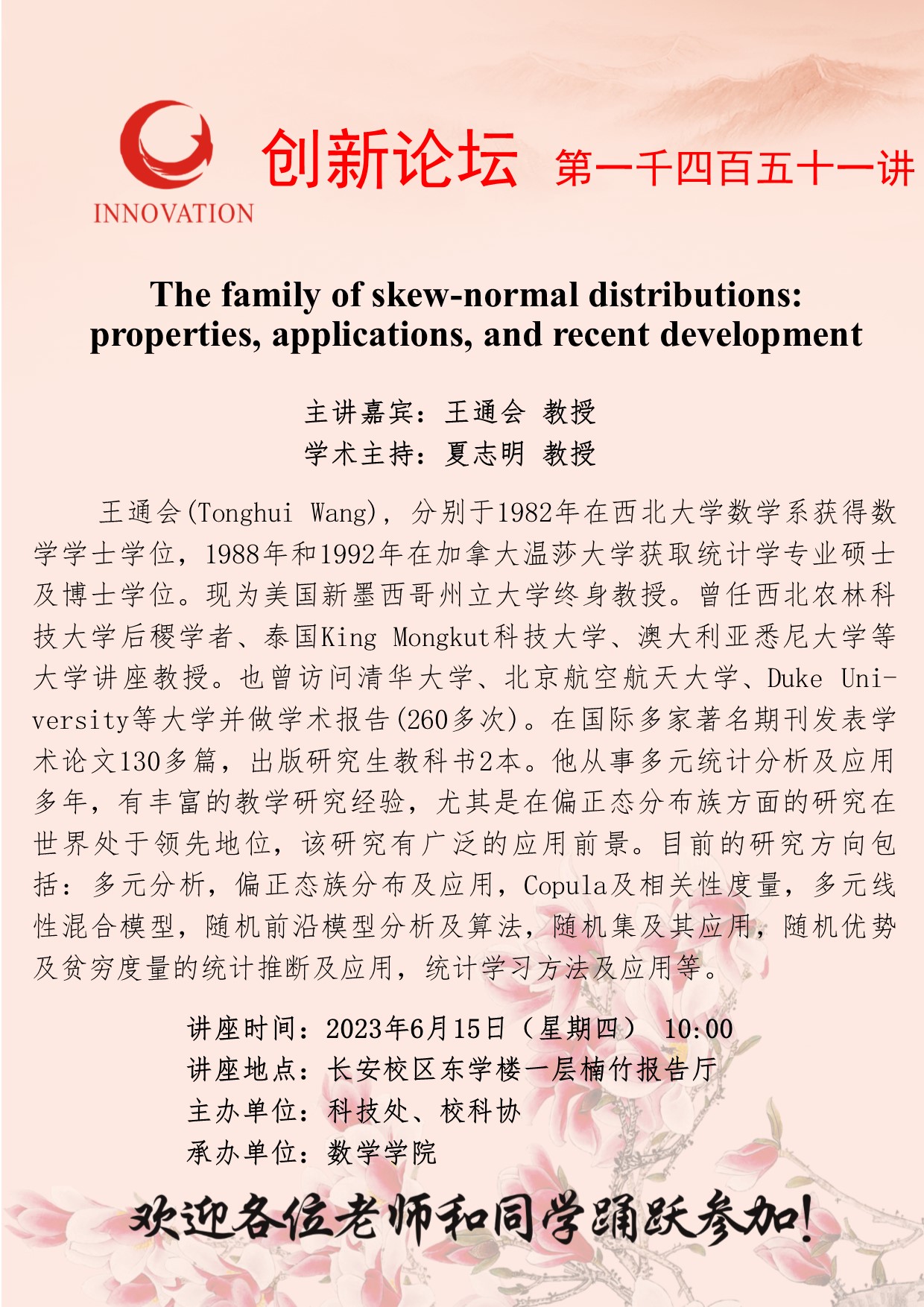 王通会 教授 welcome欢迎光临威尼斯集团创新论坛第一千四百五十一讲:The family of skew-normal distributions: properties, applications, and recent development 讲座时间 2023年6月15日(星期四) 10:00 讲座地点 长安校区东学楼一层楠竹报告厅 讲座人介绍 王通会 教授 讲座内容