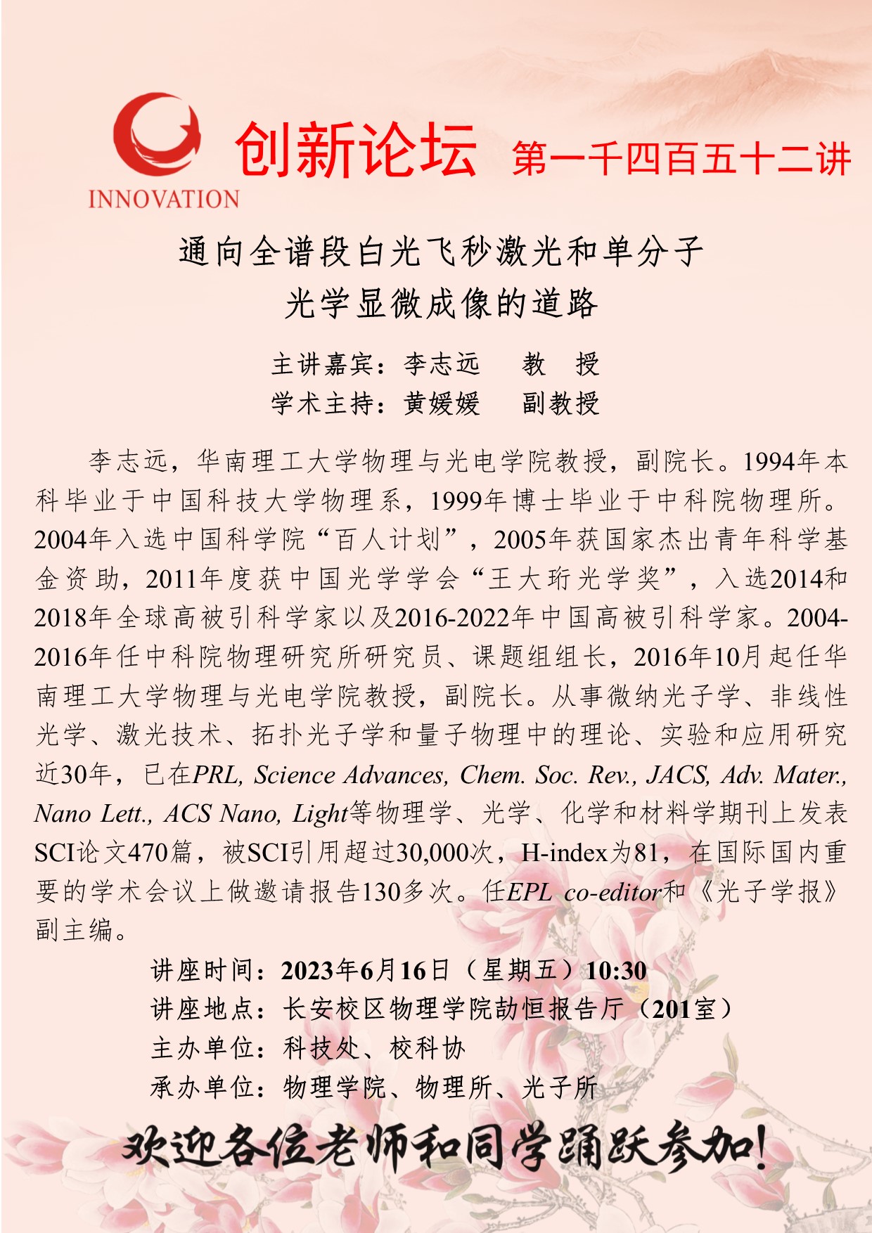 李志远 教授 welcome欢迎光临威尼斯集团创新论坛第一千四百五十二讲:通向全谱段白光飞秒激光和单分子光学显微成像的道路 讲座时间 2023年6月16日(星期五)10:30 讲座地点 长安校区物理学院劼恒报告厅(201室) 讲座人介绍 李志远 教授 讲座内容