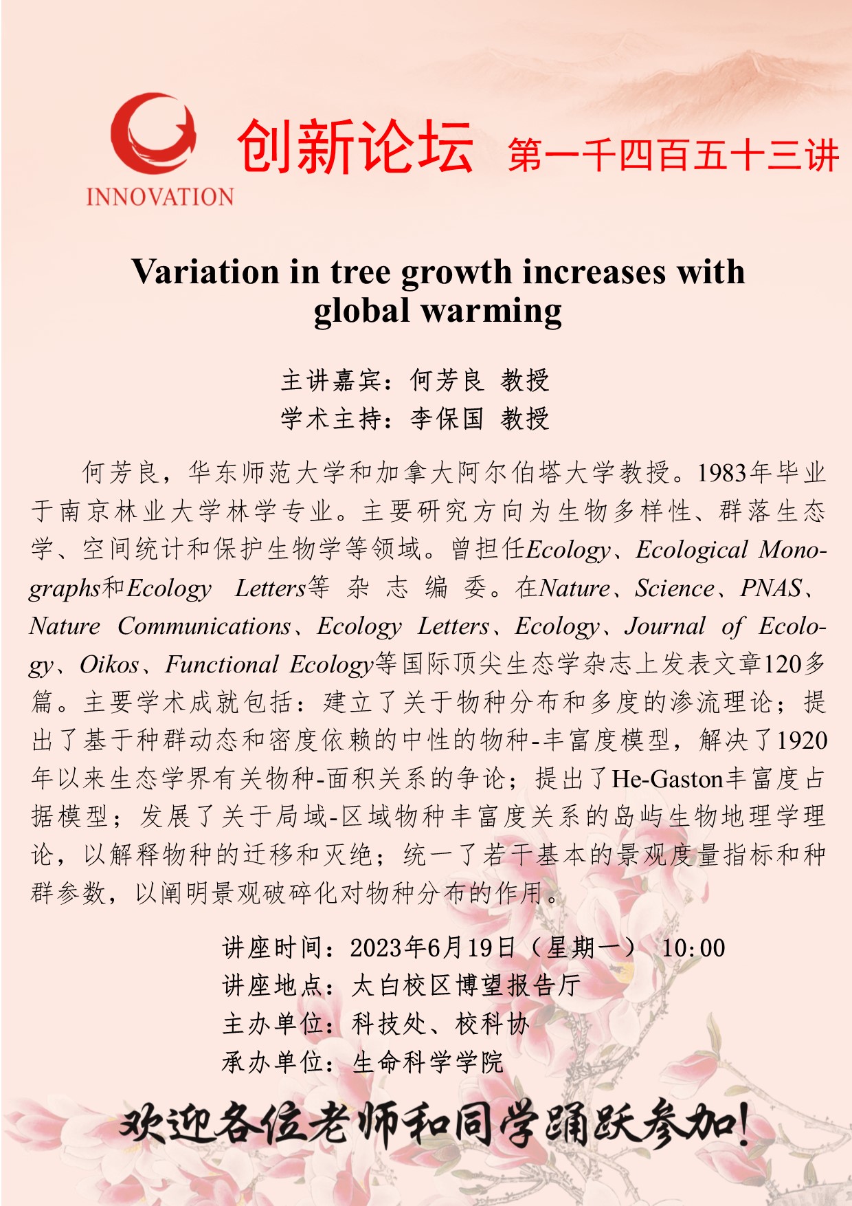 何芳良 教授 welcome欢迎光临威尼斯集团创新论坛第一千四百五十三讲:Variation in tree growth increases with global warming 讲座时间 2023年6月19日(星期一) 10:00 讲座地点 太白校区博望报告厅 讲座人介绍 何芳良 教授 讲座内容