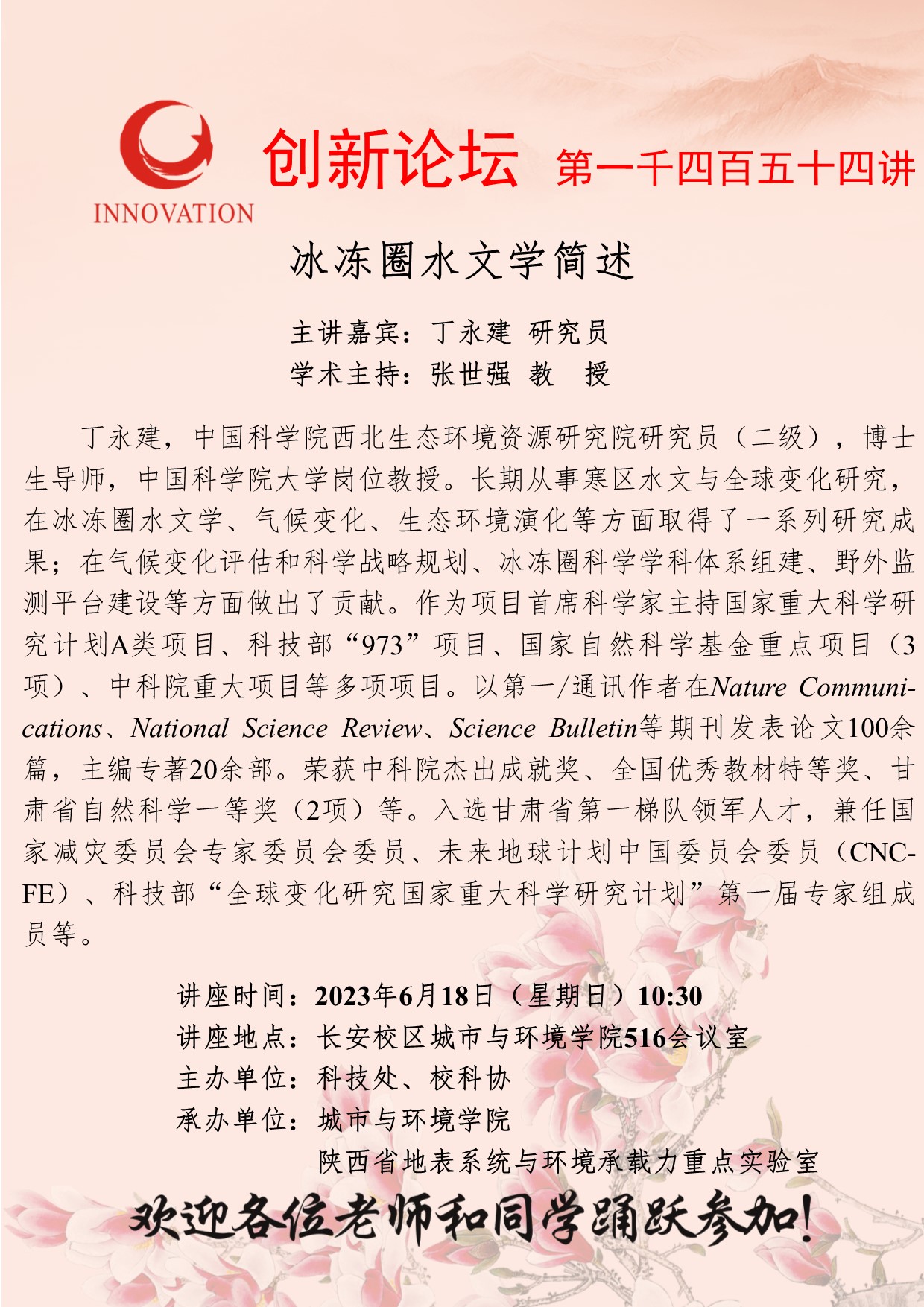 丁永建 研究员 welcome欢迎光临威尼斯集团创新论坛第一千四百五十四讲:冰冻圈水文学简述 讲座时间 2023年6月18日(星期日)10:30 讲座地点 长安校区城市与环境学院516会议室 讲座人介绍 丁永建 研究员 讲座内容