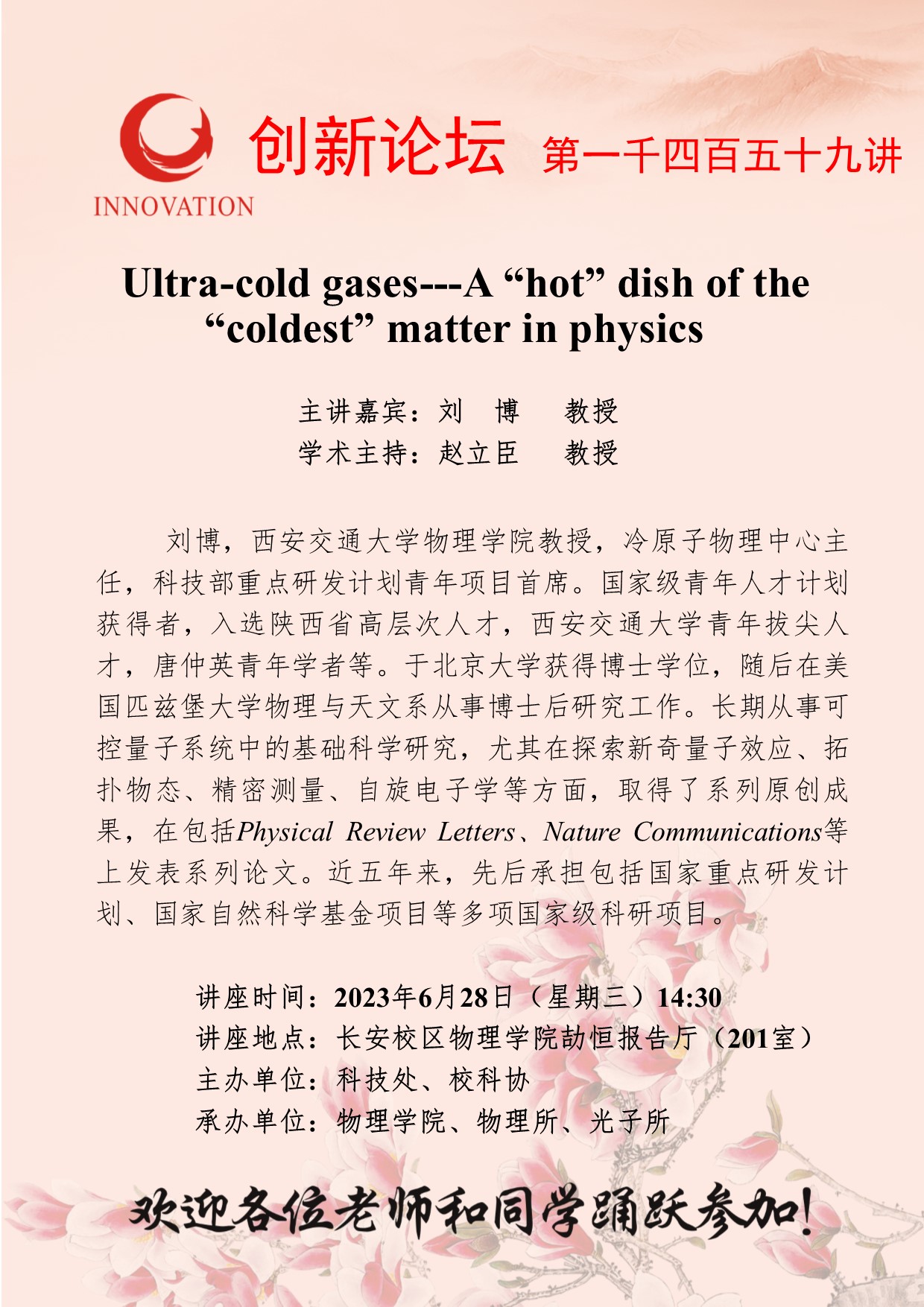 刘 博 教授 welcome欢迎光临威尼斯集团创新论坛第一千四百五十九讲:Ultra-cold gases---A “hot” dish of the “coldest” matter in physics 讲座时间 2023年6月28日(星期三)14:30 讲座地点 长安校区物理学院劼恒报告厅(201室) 讲座人介绍 刘 博 教授 讲座内容