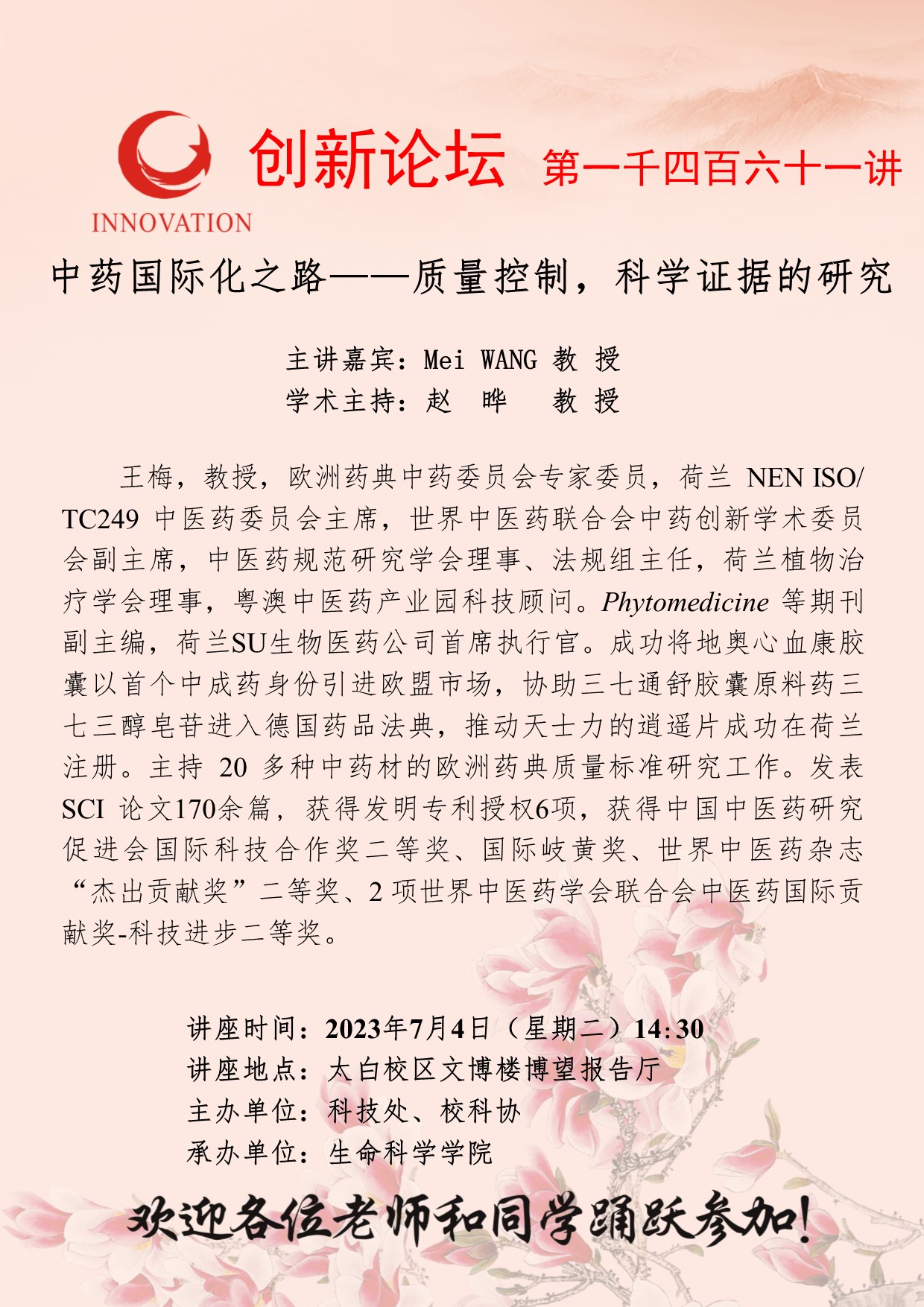Mei WANG 教授 welcome欢迎光临威尼斯集团创新论坛第一千四百六十一讲:中药国际化之路——质量控制,科学证据的研究 讲座时间 2023年7月4日(星期二)14:30 讲座地点 太白校区文博楼博望报告厅 讲座人介绍 Mei WANG 教授 讲座内容