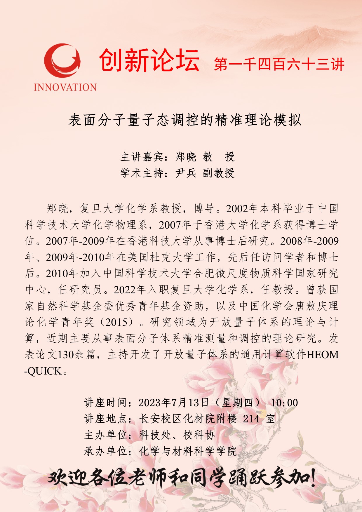 郑晓 教授 welcome欢迎光临威尼斯集团创新论坛第一千四百六十三讲:表面分子量子态调控的精准理论模拟 讲座时间 023年7月13日(星期四) 10:00 讲座地点 长安校区化材院附楼214室 讲座人介绍 郑晓 教授 讲座内容