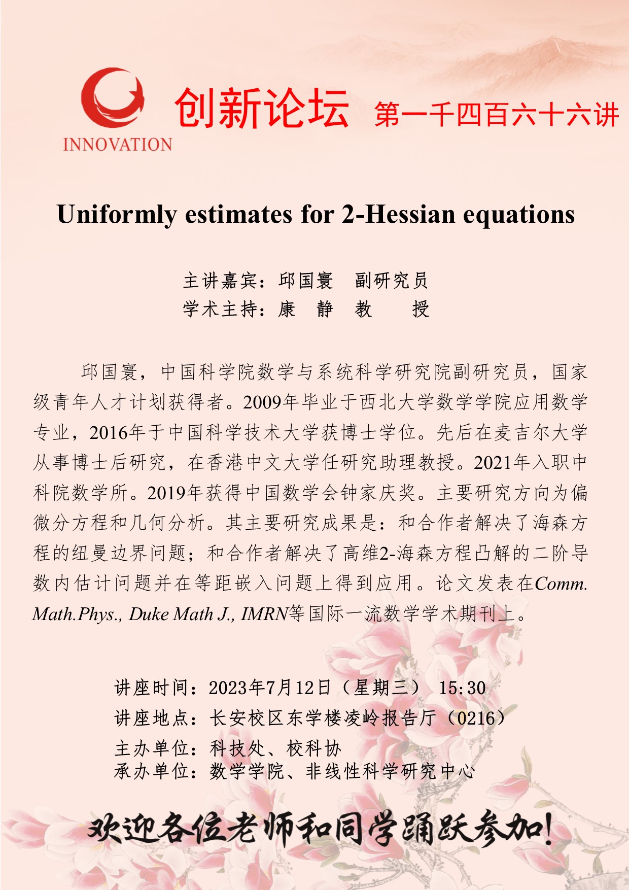 邱国寰 副研究员 welcome欢迎光临威尼斯集团创新论坛第一千四百六十六讲:Uniformly estimates for 2-Hessian equations 讲座时间 2023年7月12日(星期三) 15:30 讲座地点 长安校区东学楼凌岭报告厅(0216) 讲座人介绍 邱国寰 副研究员 讲座内容