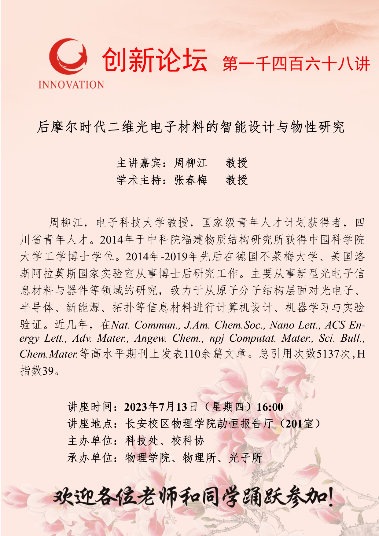 周柳江 教授 welcome欢迎光临威尼斯集团创新论坛第一千四百六十八讲:后摩尔时代二维光电子材料的智能设计与物性研究 讲座时间 2023年7月13日(星期四)16:00 讲座地点 长安校区物理学院劼恒报告厅(201室) 讲座人介绍 周柳江 教授 讲座内容