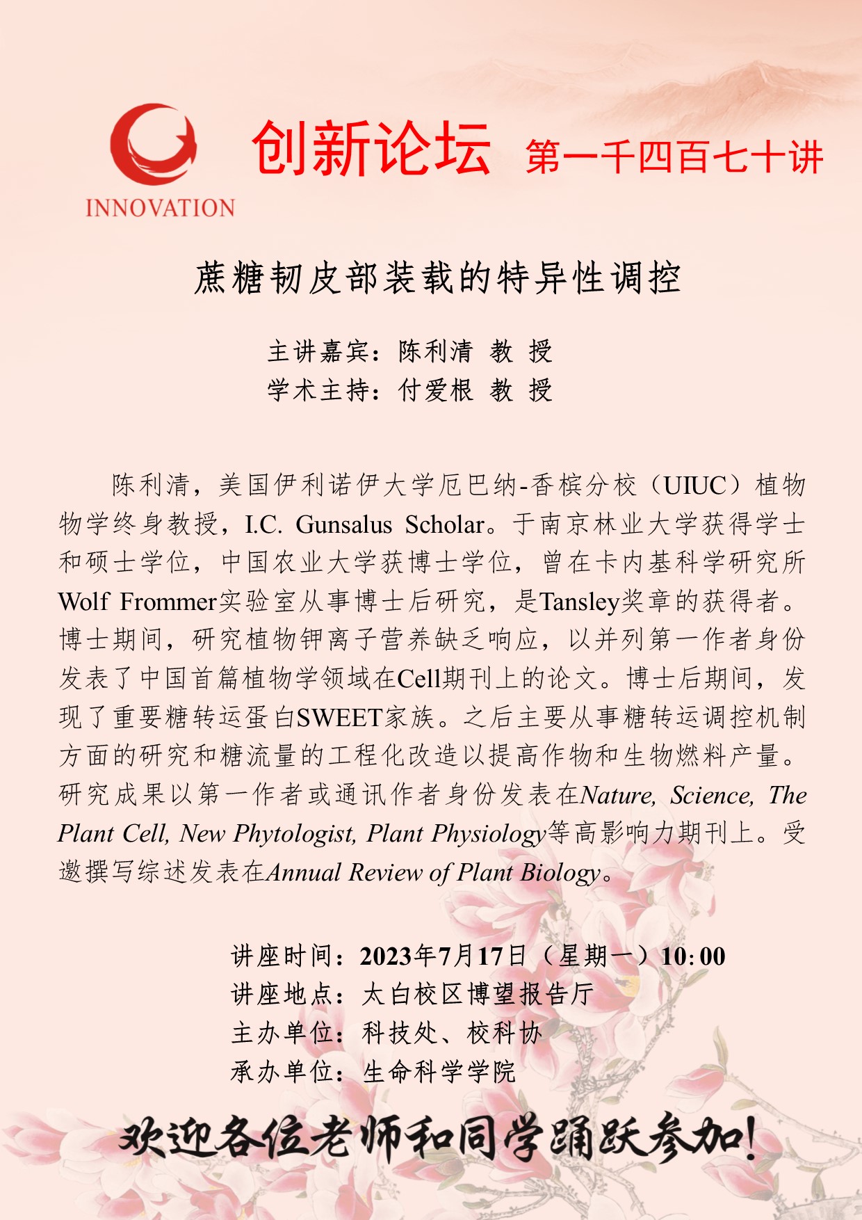 陈利清 教授 welcome欢迎光临威尼斯集团创新论坛第一千四百七十讲:蔗糖韧皮部装载的特异性调控 讲座时间 2023年7月17日(星期一)10:00 讲座地点 太白校区博望报告厅 讲座人介绍 陈利清 教授 讲座内容