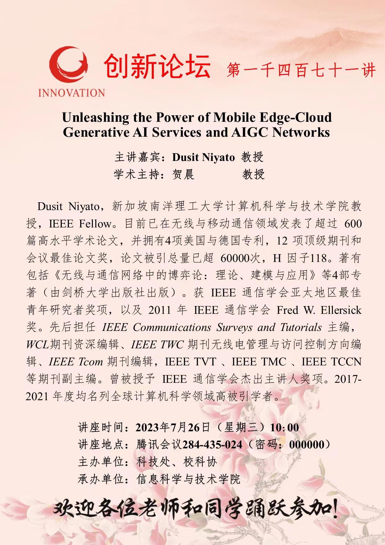 Dusit Niyato 教授 welcome欢迎光临威尼斯集团创新论坛第一千四百七十一讲:Unleashing the Power of Mobile Edge-Cloud Generative AI Services and AIGC Networks 讲座时间 2023年7月26日(星期三)10:00 讲座地点 腾讯会议284-435-024(密码:000000) 讲座人介绍 Dusit Niyato 教授 讲座内容