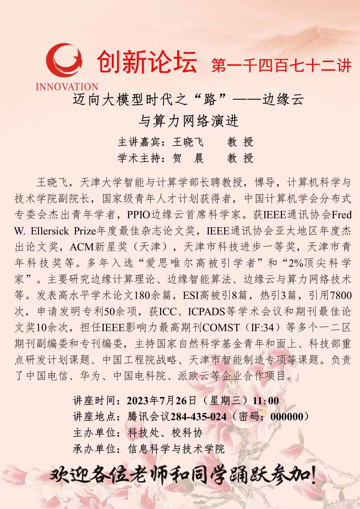 王晓飞 教授 welcome欢迎光临威尼斯集团创新论坛第一千四百七十二讲:迈向大模型时代之“路”—边缘云与算力网络演进 讲座时间 2023年7月26日(星期三)11:00 讲座地点 腾讯会议284-435-024(密码:000000) 讲座人介绍 王晓飞 教授 讲座内容