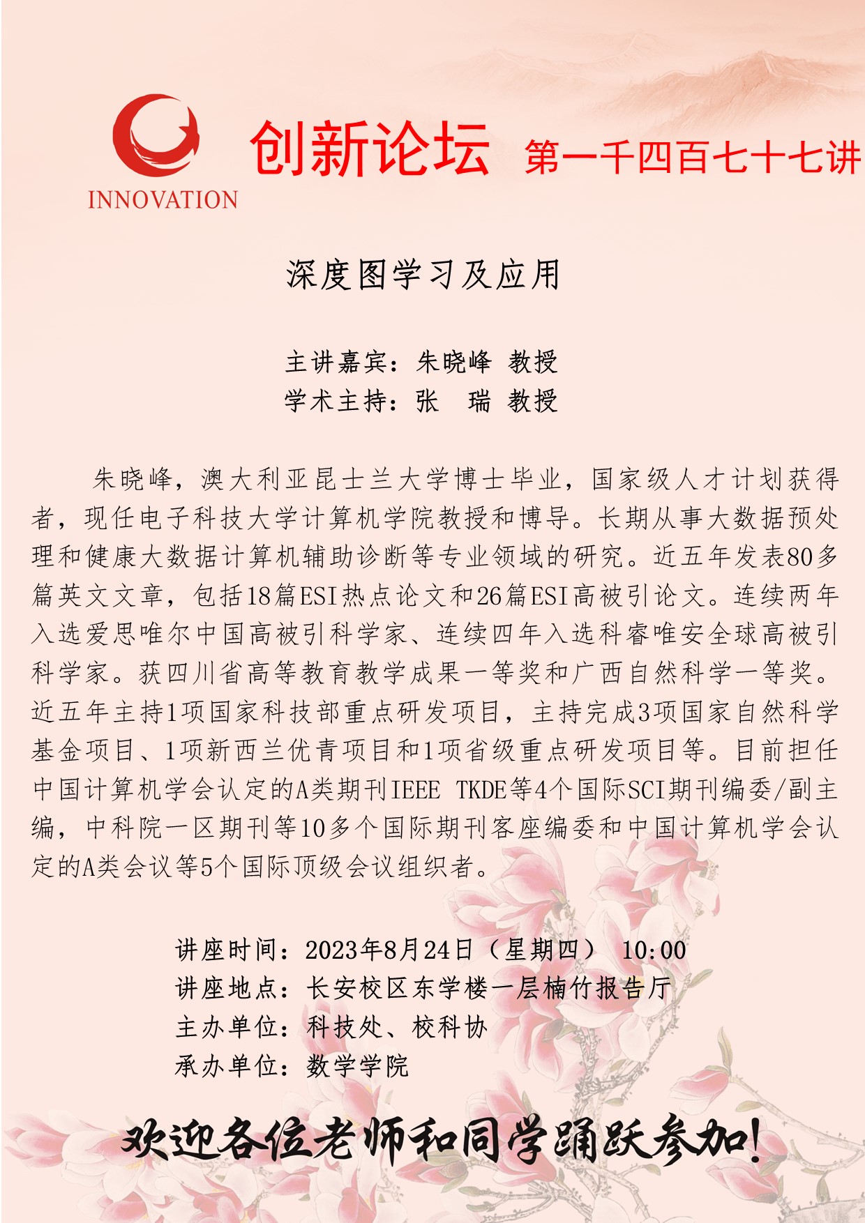 朱晓峰 教授 welcome欢迎光临威尼斯集团创新论坛第一千四百七十七讲:深度图学习及应用 讲座时间 2023年8月24日(星期四) 10:00 讲座地点 长安校区东学楼一层楠竹报告厅 讲座人介绍 朱晓峰 教授 讲座内容