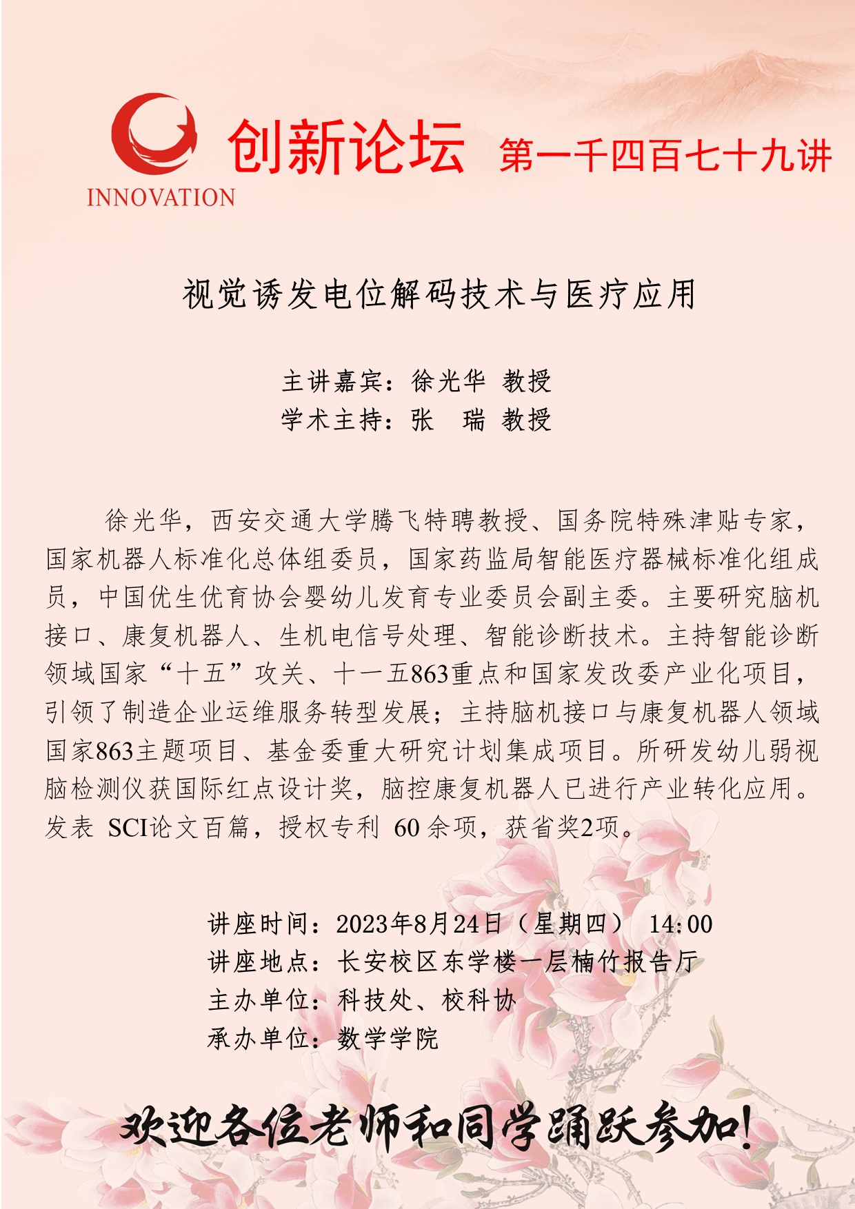 徐光华 教授 welcome欢迎光临威尼斯集团创新论坛第一千四百七十九讲:视觉诱发电位解码技术与医疗应用 讲座时间 2023年8月24日(星期四) 14:00 讲座地点 长安校区东学楼一层楠竹报告厅 讲座人介绍 徐光华 教授 讲座内容