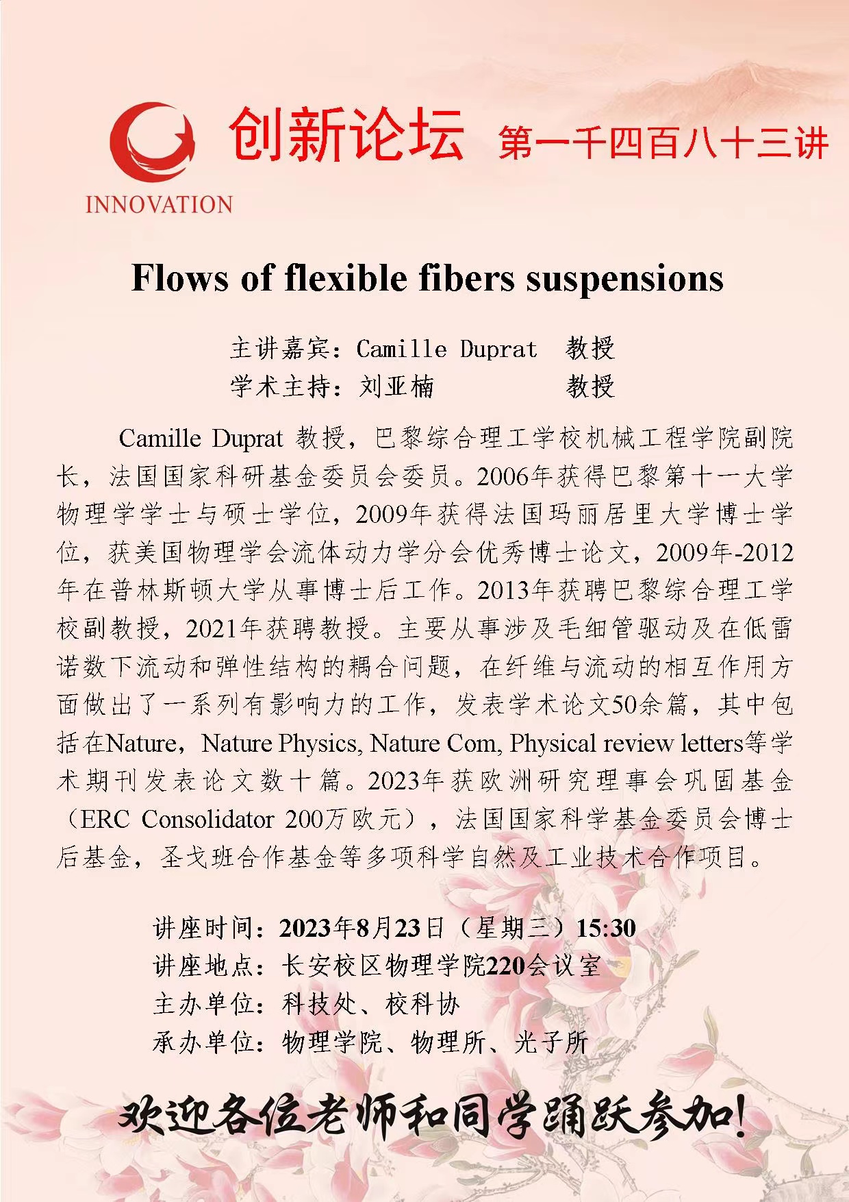 Camille Duprat 教授 welcome欢迎光临威尼斯集团创新论坛第一千四百八十三讲:Flows of flexible fibers suspensions 讲座时间 2023年8月23日(星期三) 15:30 讲座地点 长安校区物理学院220会议室 讲座人介绍 Camille Duprat 教授 讲座内容