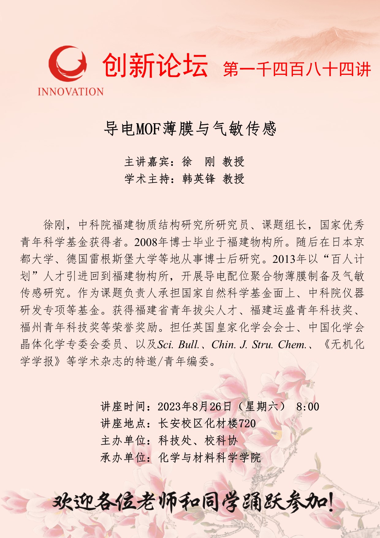 徐刚 教授 welcome欢迎光临威尼斯集团创新论坛第一千四百八十四讲:导电MOF薄膜与气敏传感 讲座时间 2023年8月26日(星期六) 8:00 讲座地点 长安校区化材楼720 讲座人介绍 徐刚 教授 讲座内容