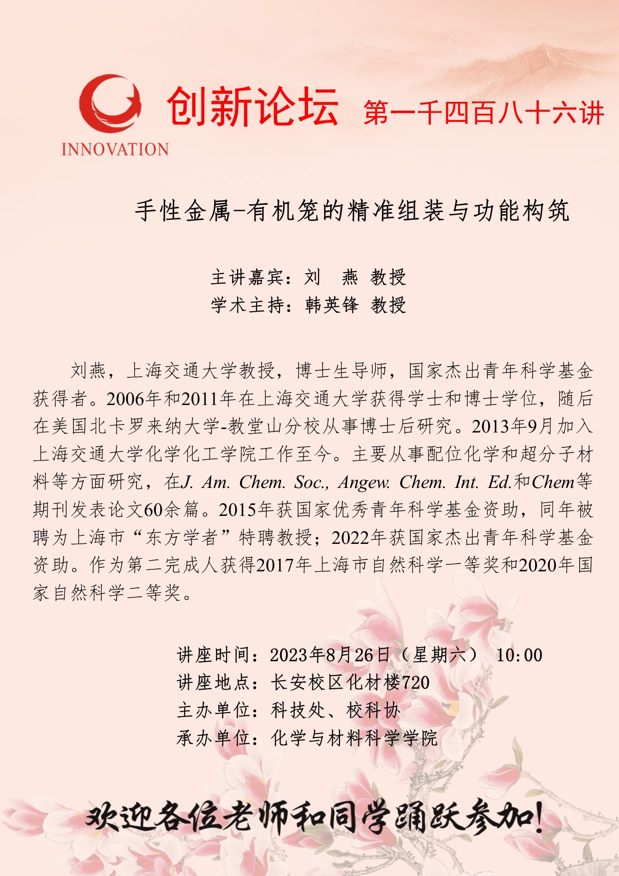 刘燕 教授 welcome欢迎光临威尼斯集团创新论坛第一千四百八十六讲:手性金属-有机笼的精准组装与功能构筑 讲座时间 2023年8月26日(星期六) 10:00 讲座地点 长安校区化材楼720 讲座人介绍 刘燕 教授 讲座内容