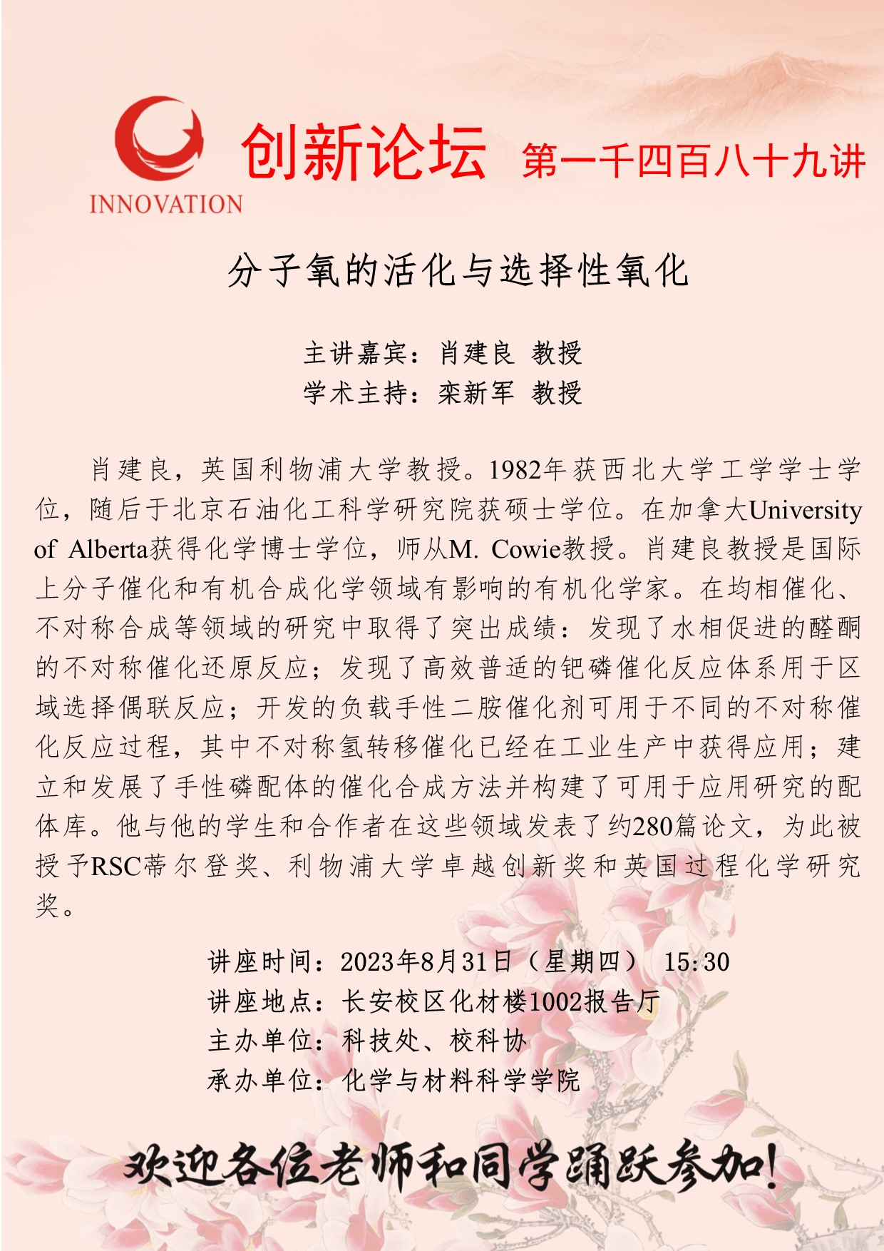 肖建良 教授 welcome欢迎光临威尼斯集团创新论坛第一千四百八十九讲:分子氧的活化与选择性氧化 讲座时间 2023年8月31日(星期四) 15:30 讲座地点 长安校区化材楼1002报告厅 讲座人介绍 肖建良 教授 讲座内容