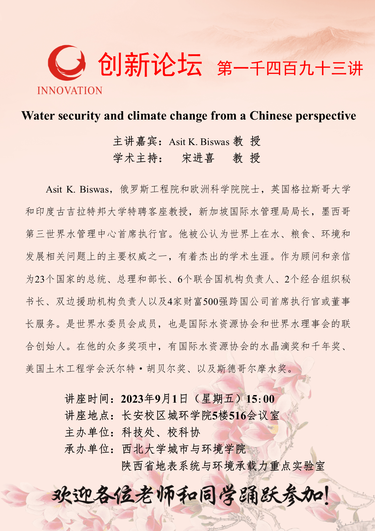 Asit K. Biswas 教授 welcome欢迎光临威尼斯集团创新论坛第一千四百九十三讲:Water security and climate change from a Chinese perspective 讲座时间 2023年9月1日(星期五)15:00 讲座地点 长安校区城环学院5楼516会议室 讲座人介绍 Asit K. Biswas 教授 讲座内容