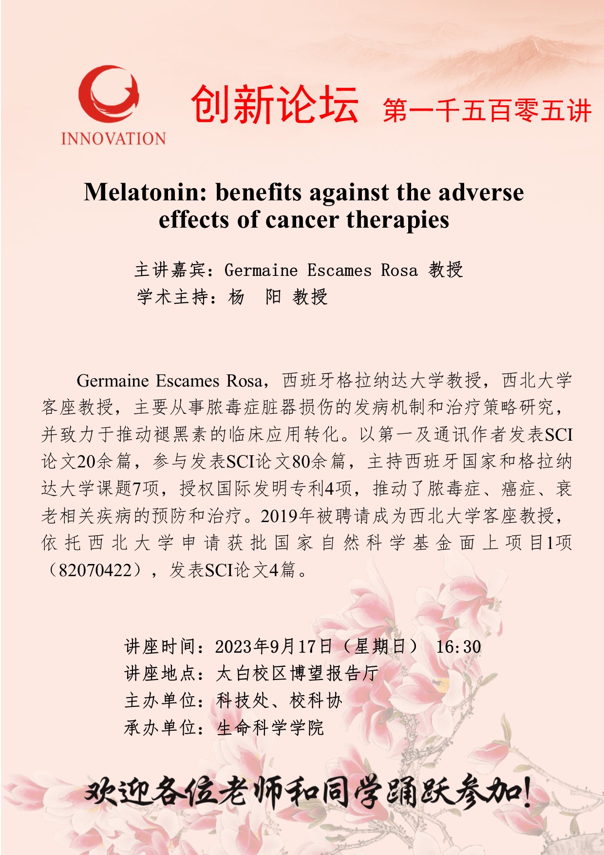 Germaine Escames Rosa 教授 welcome欢迎光临威尼斯集团创新论坛第一千五百零五讲:Melatonin: benefits against the adverse effects of cancer therapies 讲座时间 2023年9月17日(星期日) 16:30 讲座地点 太白校区博望报告厅 讲座人介绍 Germaine Escames Rosa 教授 讲座内容