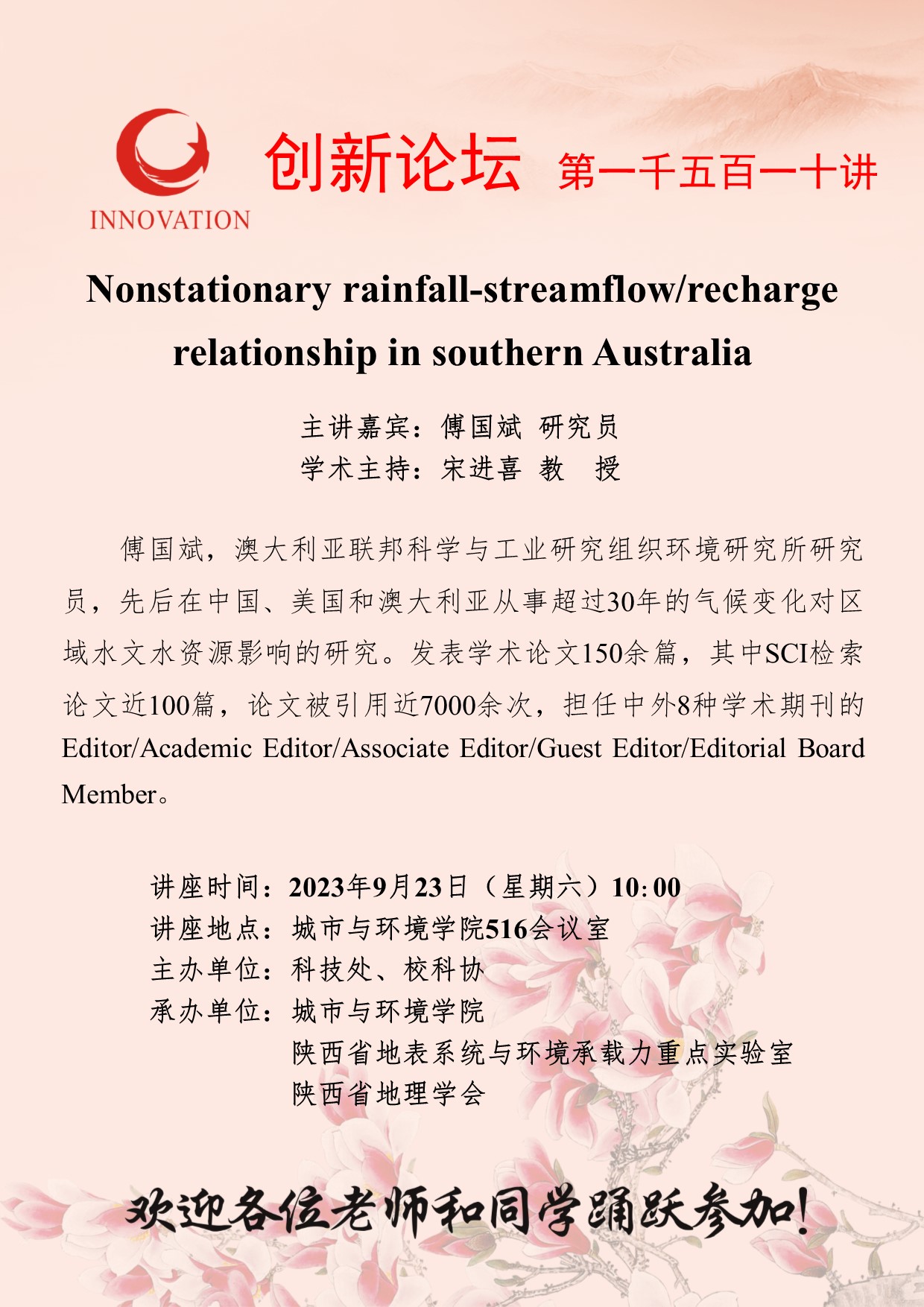 傅国斌 研究员 welcome欢迎光临威尼斯集团创新论坛第一千五百一十讲:Nonstationary rainfall‐streamflow/recharge relationship in southern Australia 讲座时间 2023年9月23日(星期六)10:00 讲座地点 城市与环境学院516会议室 讲座人介绍 傅国斌 研究员 讲座内容