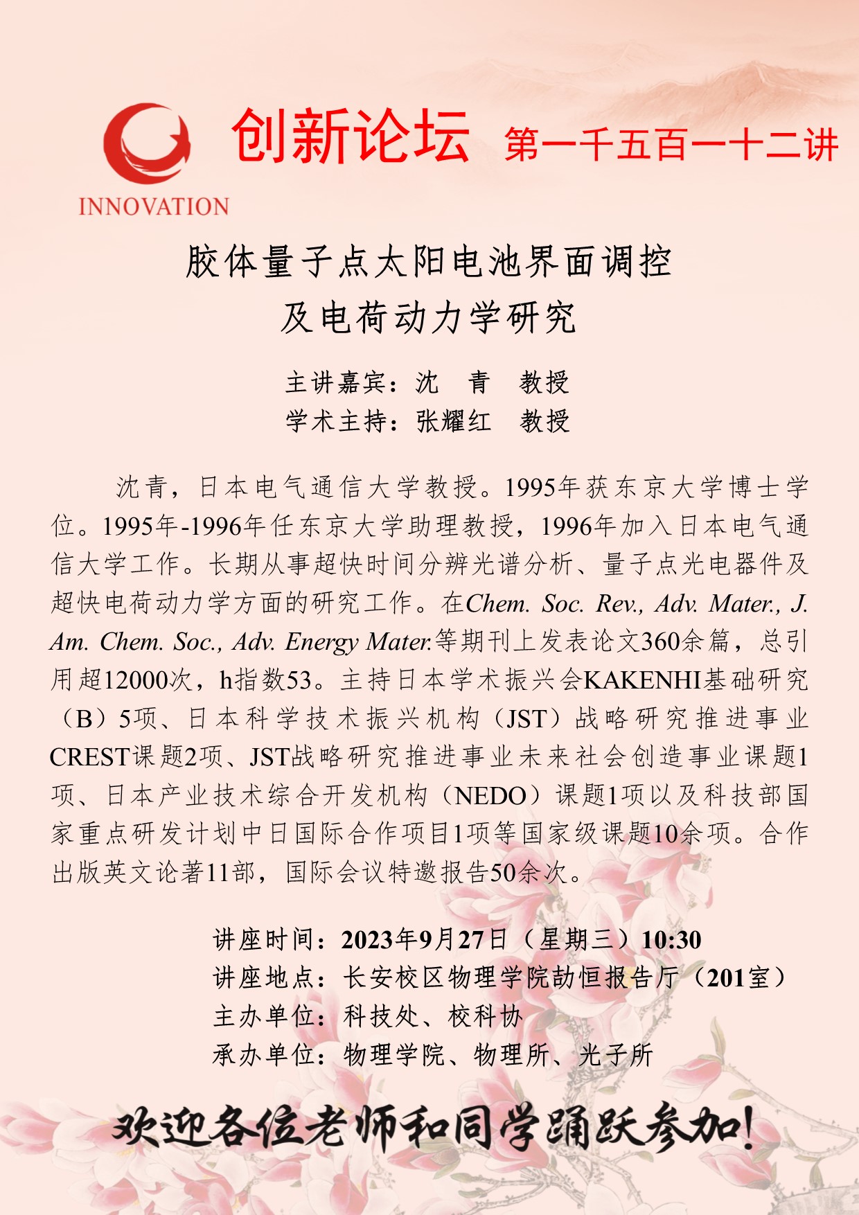 沈青 教授 welcome欢迎光临威尼斯集团创新论坛第一千五百一十二讲:胶体量子点太阳电池界面调控及电荷动力学研究 讲座时间 2023年9月27日(星期三)10:30 讲座地点 长安校区物理学院劼恒报告厅(201室) 讲座人介绍 沈青 教授 讲座内容