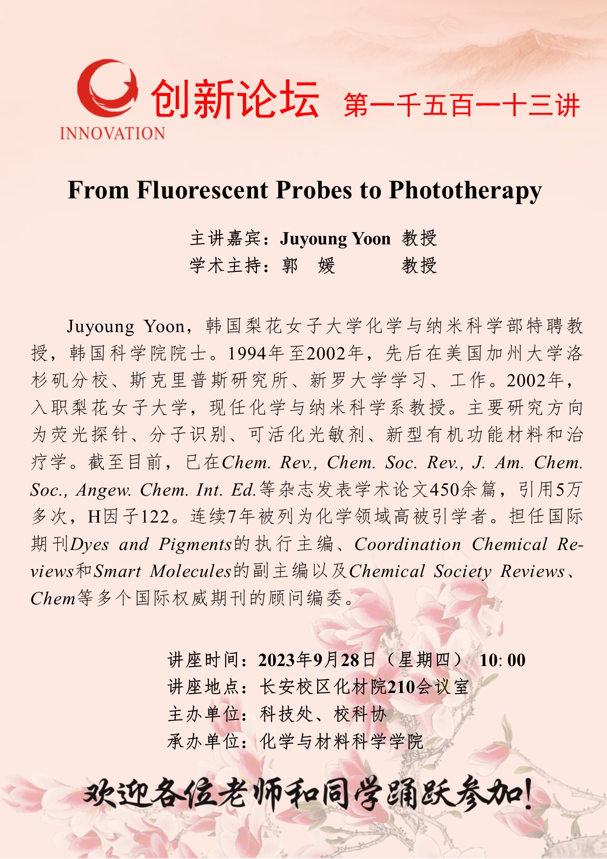 Juyoung Yoon 教授 welcome欢迎光临威尼斯集团创新论坛第一千五百一十三讲:From Fluorescent Probes to Phototherapy 讲座时间 2023年9月28日(星期四) 10: 00 讲座地点 长安校区化材院210会议室 讲座人介绍 Juyoung Yoon 教授 讲座内容
