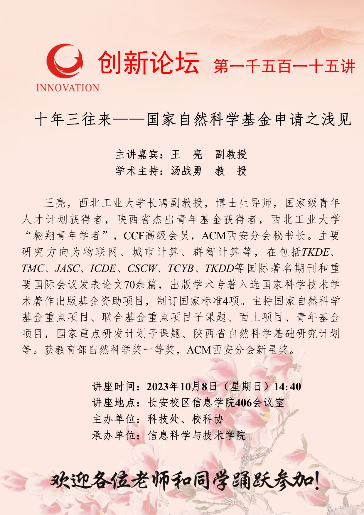 王亮 副教授 welcome欢迎光临威尼斯集团创新论坛第一千五百一十五讲: 十年三往来——国家自然科学基金申请之浅见 讲座时间 2023年10月8日(星期日)14:40 讲座地点 长安校区信息学院406会议室 讲座人介绍 王亮 副教授 讲座内容