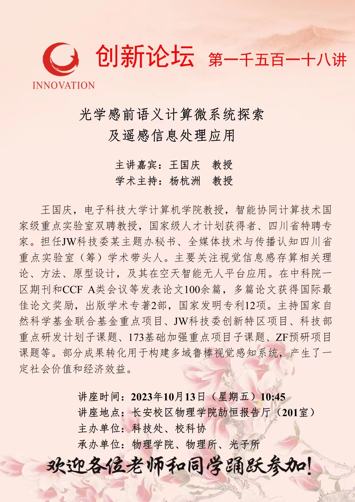 王国庆 教授 welcome欢迎光临威尼斯集团创新论坛第一千五百一十八讲:光学感前语义计算微系统探索及遥感信息处理应用 讲座时间 2023年10月13日(星期五)10:45 讲座地点 长安校区物理学院劼恒报告厅(201室) 讲座人介绍 王国庆 教授 讲座内容