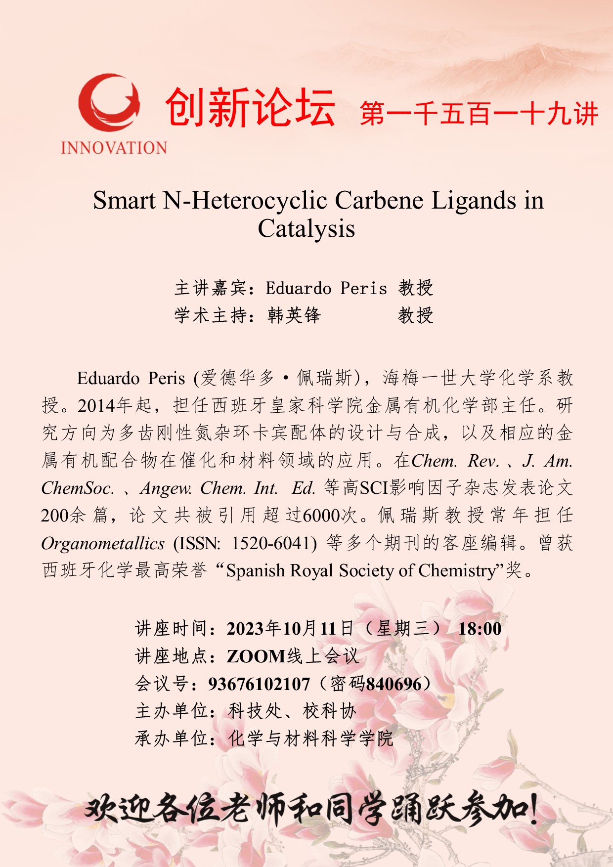 Eduardo Peris 教授 welcome欢迎光临威尼斯集团创新论坛第一千五百一十九讲: Smart N-Heterocyclic Carbene Ligands in Catalysis 讲座时间 2023年10月11日(星期三) 18:00 讲座地点 ZOOM线上会议 讲座人介绍 Eduardo Peris 教授 讲座内容