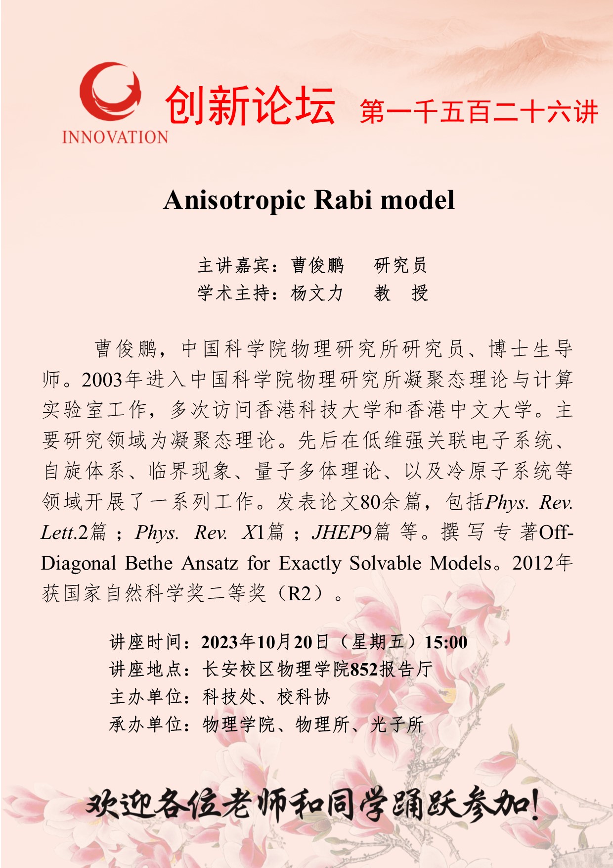 曹俊鹏 研究员 welcome欢迎光临威尼斯集团创新论坛第一千五百二十六讲:Anisotropic Rabi model 讲座时间 2023年10月20日(星期五)15:00 讲座地点 长安校区物理学院852报告厅 讲座人介绍 曹俊鹏 研究员 讲座内容