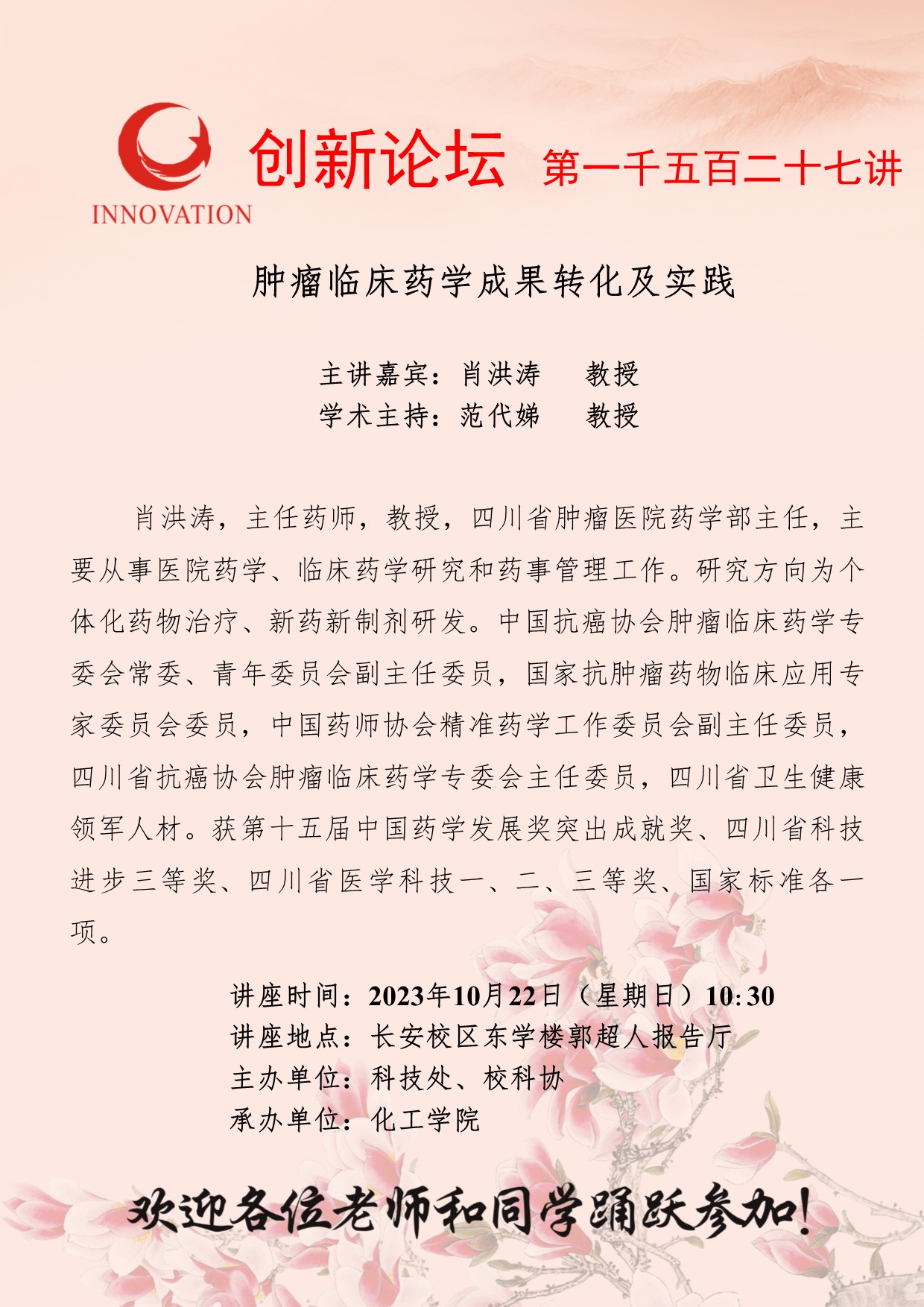 肖洪涛 教授 welcome欢迎光临威尼斯集团创新论坛第一千五百二十七讲:肿瘤临床药学成果转化及实践 讲座时间 2023年10月22日(星期日)10:30 讲座地点 长安校区东学楼郭超人报告厅 讲座人介绍 肖洪涛 教授 讲座内容