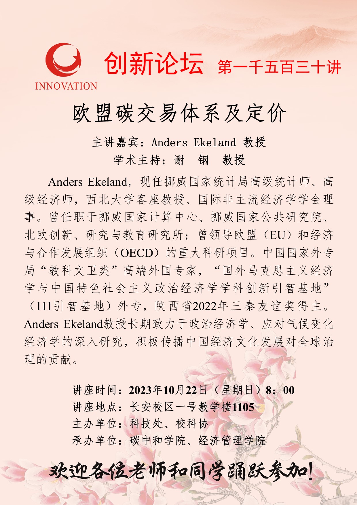 Anders Ekeland 教授 welcome欢迎光临威尼斯集团创新论坛第一千五百三十讲:欧盟碳交易体系及定价 讲座时间 2023年10月22日(星期日) 8:00 讲座地点 长安校区一号教学楼1105 讲座人介绍 Anders Ekeland 教授 讲座内容