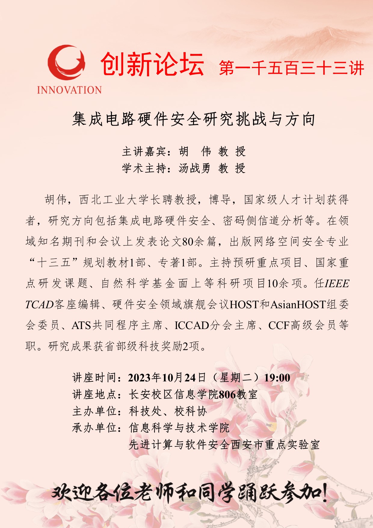 胡 伟 教授 welcome欢迎光临威尼斯集团创新论坛第一千五百三十三讲:集成电路硬件安全研究挑战与方向 讲座时间 2023年10月24日(星期二)19:00 讲座地点 长安校区信息学院806教室 讲座人介绍 胡 伟 教授 讲座内容