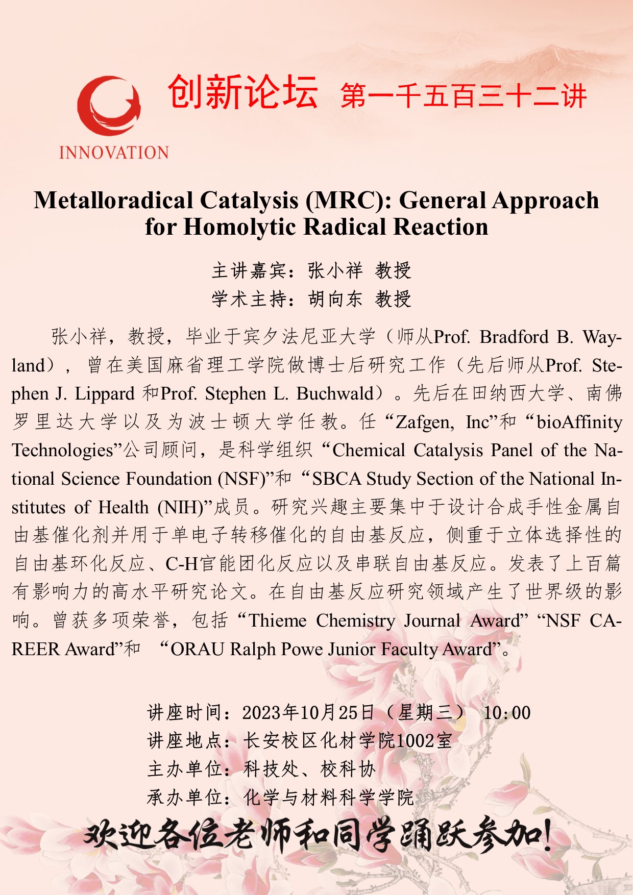 张小祥 教授 welcome欢迎光临威尼斯集团创新论坛第一千五百三十二讲:Metalloradical Catalysis (MRC): General Approach for Homolytic Radical Reaction 讲座时间 2023年10月25日(星期三) 10:00 讲座地点 长安校区化材学院1002室 讲座人介绍 张小祥 教授 讲座内容