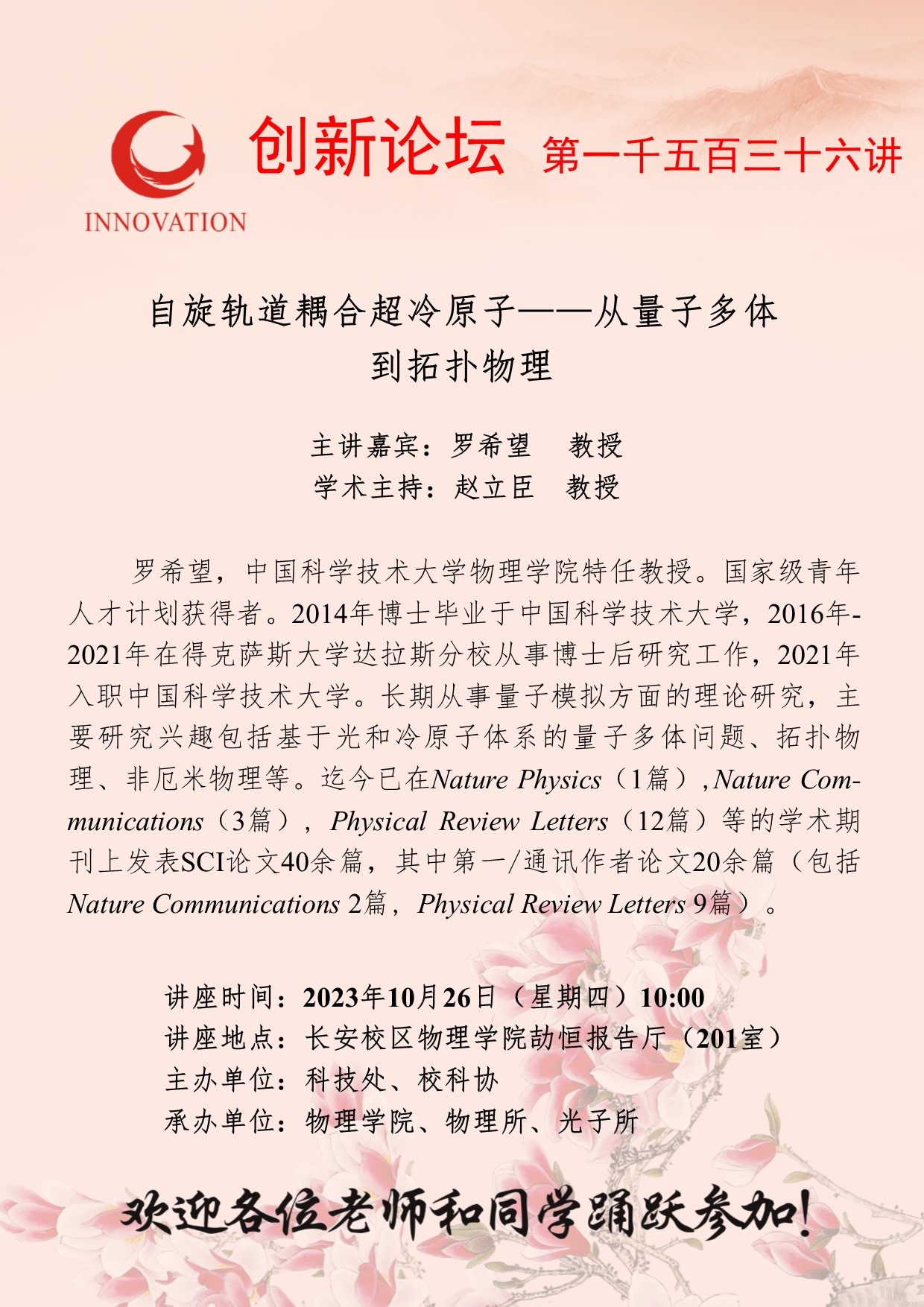 罗希望 教授 welcome欢迎光临威尼斯集团创新论坛第一千五百三十六讲:自旋轨道耦合超冷原子——从量子多体到拓扑物理 讲座时间 2023年10月26日(星期四)10:00 讲座地点 长安校区物理学院劼恒报告厅(201室) 讲座人介绍 罗希望 教授 讲座内容