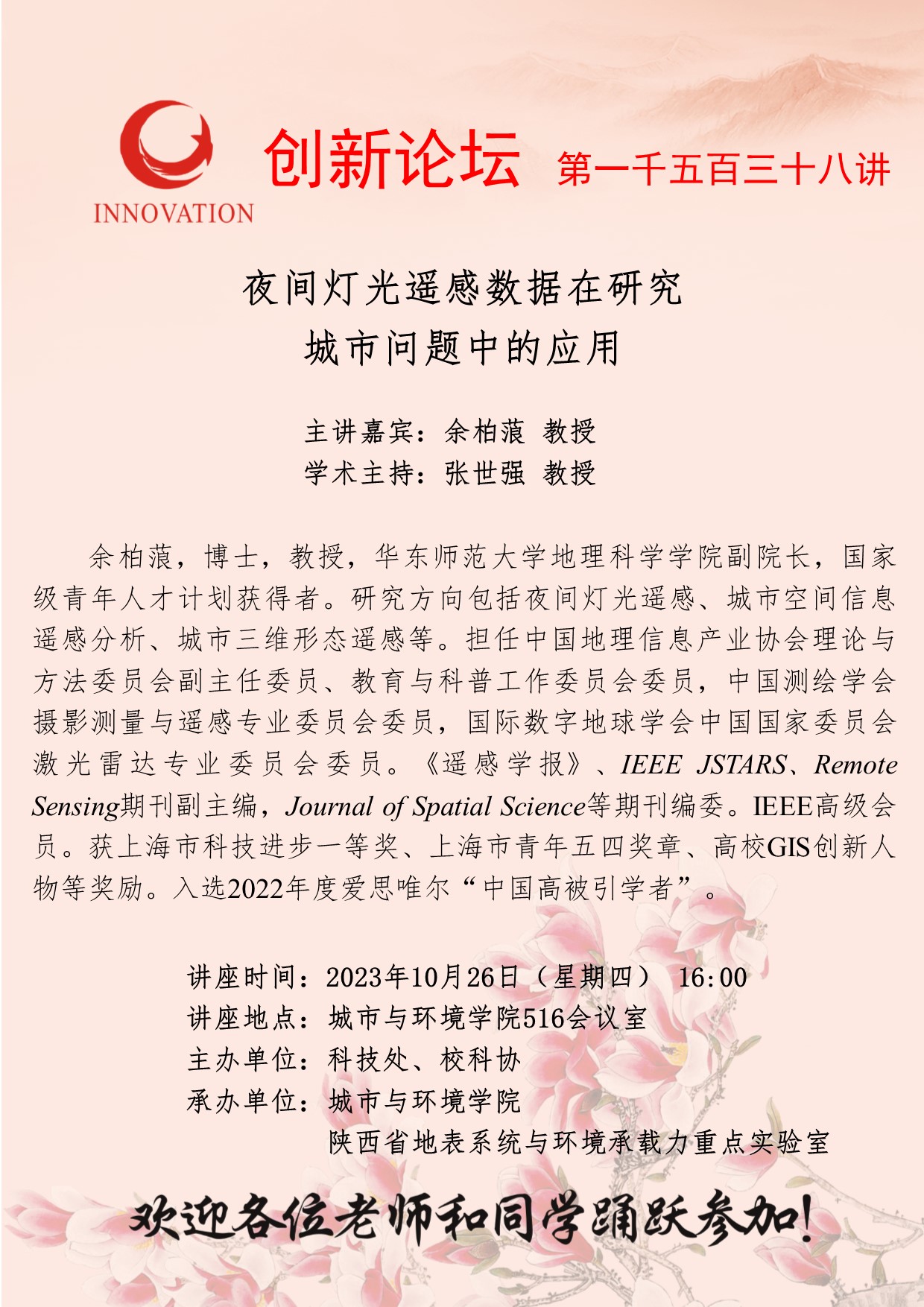 余柏蒗 教授 welcome欢迎光临威尼斯集团创新论坛第一千五百三十八讲:夜间灯光遥感数据在研究城市问题中的应用 讲座时间 2023年10月26日(星期四) 16:00 讲座地点 城市与环境学院516会议室 讲座人介绍 余柏蒗 教授 讲座内容