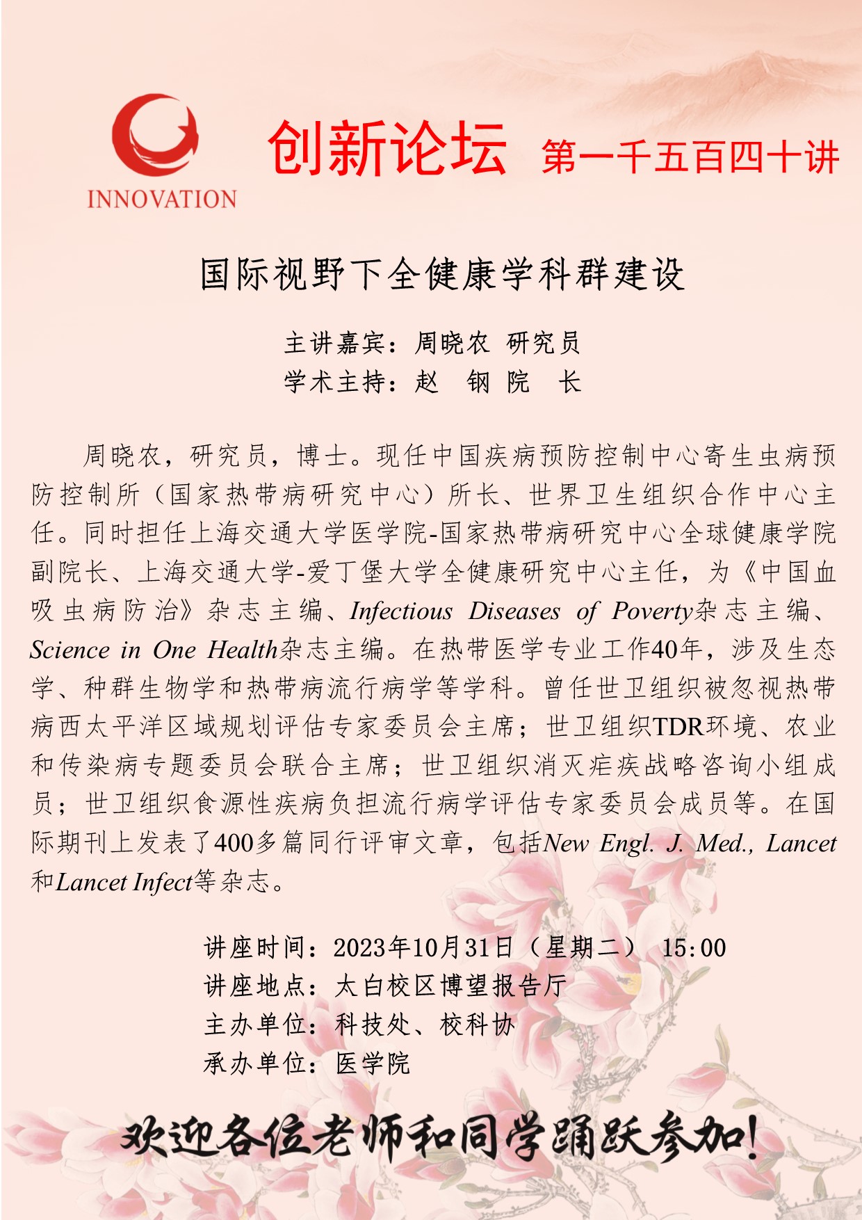 周晓农 研究员 welcome欢迎光临威尼斯集团创新论坛第一千五百四十讲:国际视野下全健康学科群建设 讲座时间 2023年10月31日(星期二) 15:00 讲座地点 太白校区博望报告厅 讲座人介绍 周晓农 研究员 讲座内容