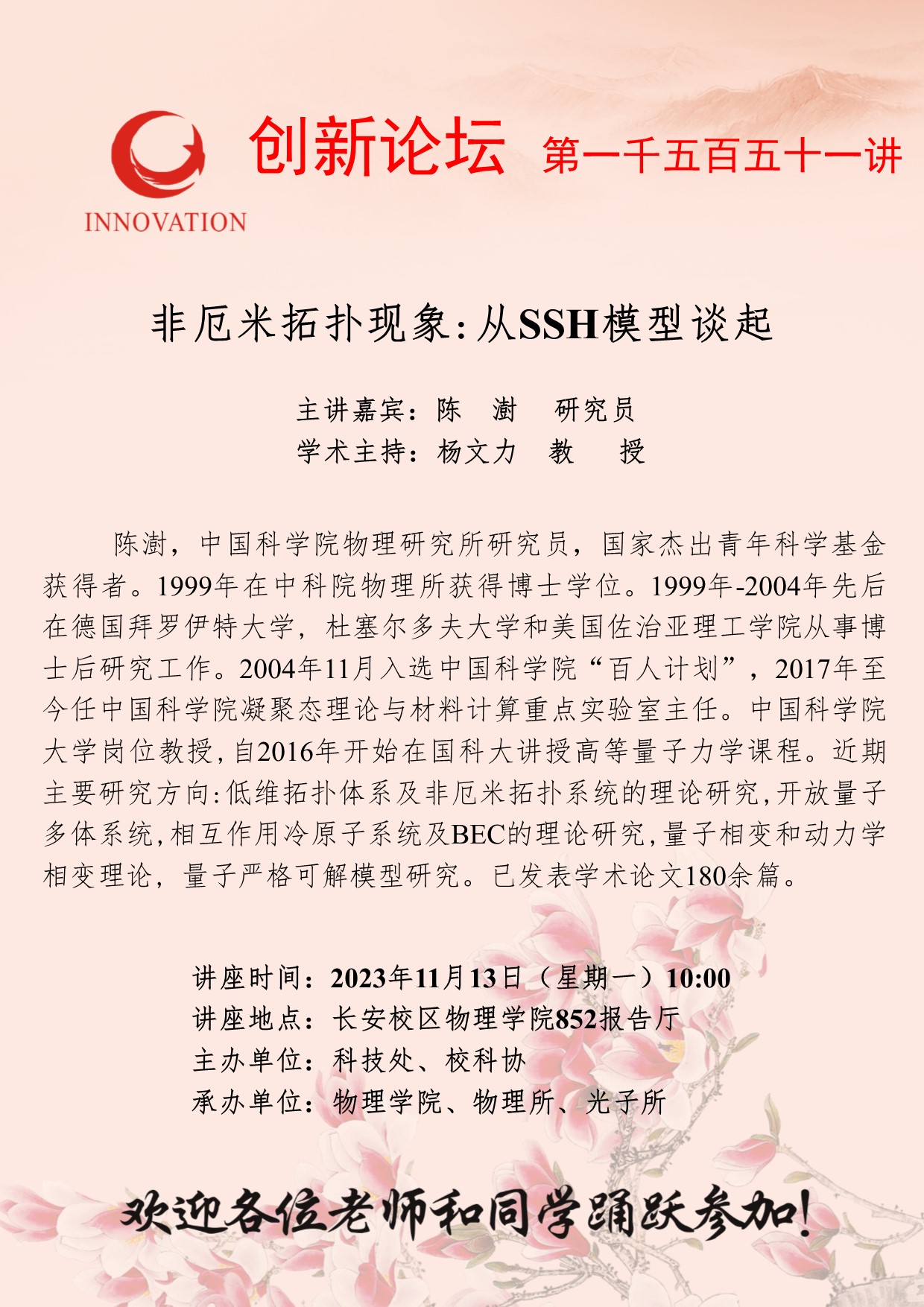 陈澍 研究员 welcome欢迎光临威尼斯集团创新论坛第一千五百五十一讲:非厄米拓扑现象:从SSH模型谈起 讲座时间 2023年11月13日(星期一)10:00 讲座地点 长安校区物理学院852报告厅 讲座人介绍 陈澍 研究员 讲座内容