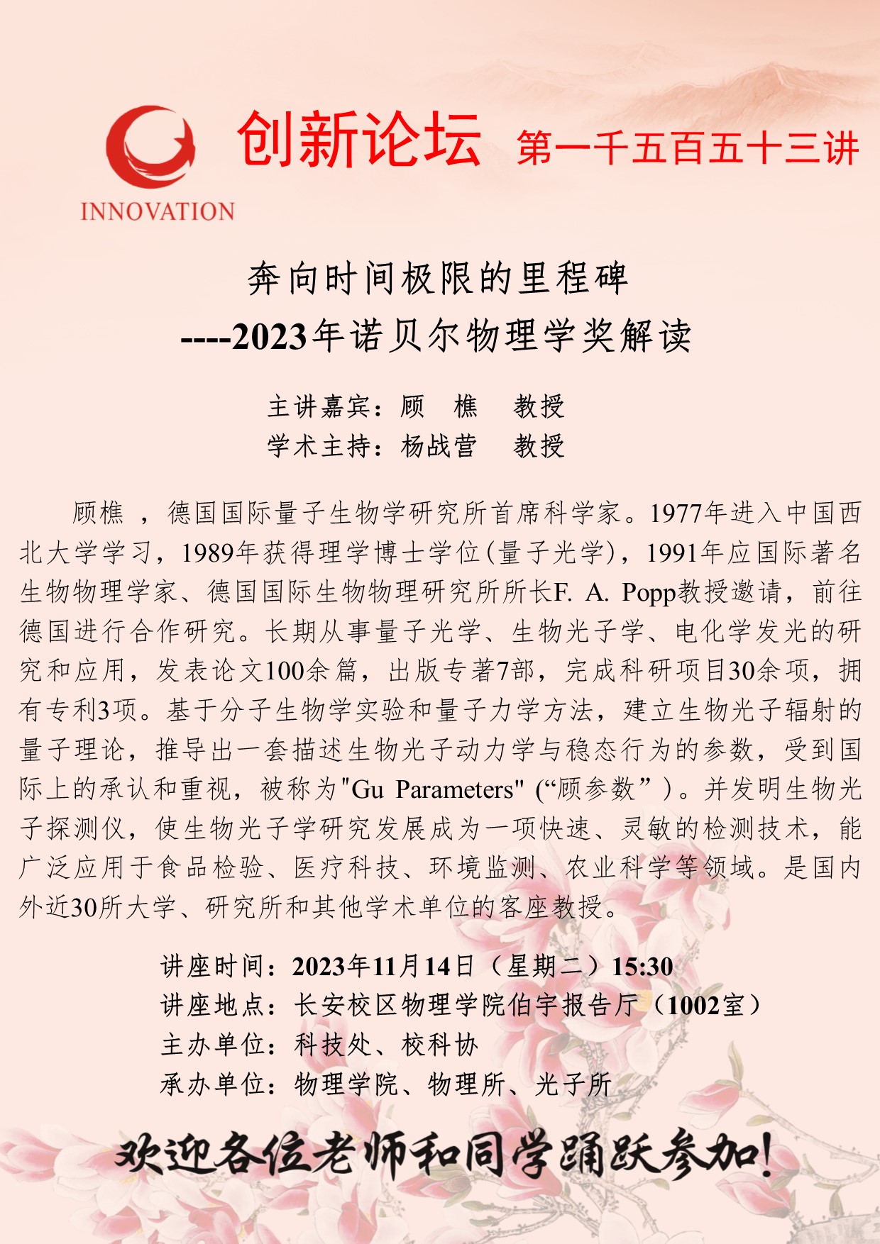 顾樵 教授 welcome欢迎光临威尼斯集团创新论坛第一千五百五十三讲:奔向时间极限的里程碑----2023年诺贝尔物理学奖解读 讲座时间 2023年11月14日(星期二)15:30 讲座地点 长安校区物理学院伯宇报告厅(1002室) 讲座人介绍 顾樵 教授 讲座内容