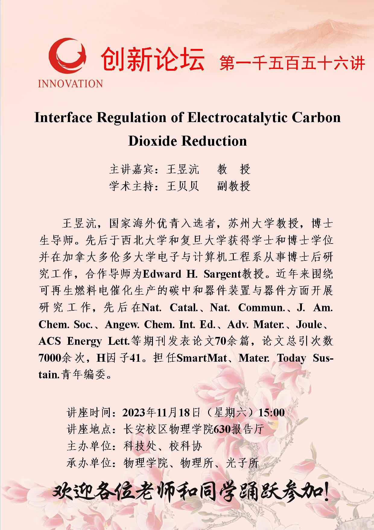 王昱沆 教授 welcome欢迎光临威尼斯集团创新论坛第一千五百五十六讲:Interface Regulation of Electrocatalytic Carbon Dioxide Reduction 讲座时间 2023年11月18日(星期六)15:00 讲座地点 长安校区物理学院630报告厅 讲座人介绍 王昱沆 教授 讲座内容