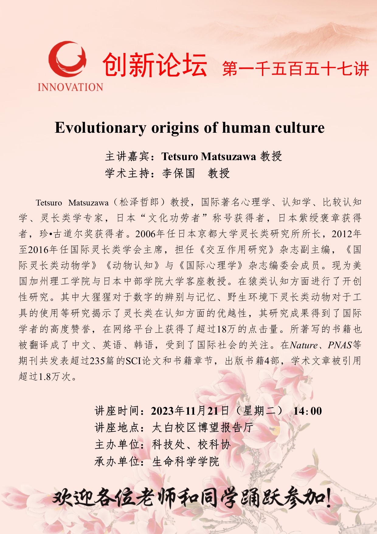 Tetsuro Matsuzawa 教授 welcome欢迎光临威尼斯集团创新论坛第一千五百五十七讲:Evolutionary origins of human culture 讲座时间 2023年11月21日(星期二) 14:00 讲座地点 太白校区博望报告厅 讲座人介绍 Tetsuro Matsuzawa 教授 讲座内容