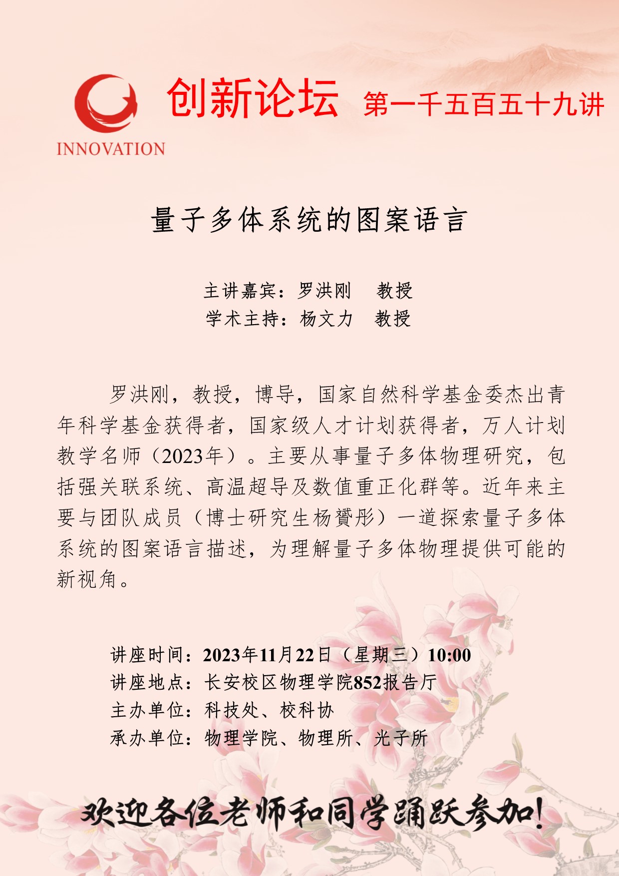 罗洪刚 教授 welcome欢迎光临威尼斯集团创新论坛第一千五百五十九讲:量子多体系统的图案语言 讲座时间 2023年11月22日(星期三)10:00 讲座地点 长安校区物理学院852报告厅 讲座人介绍 罗洪刚 教授 讲座内容